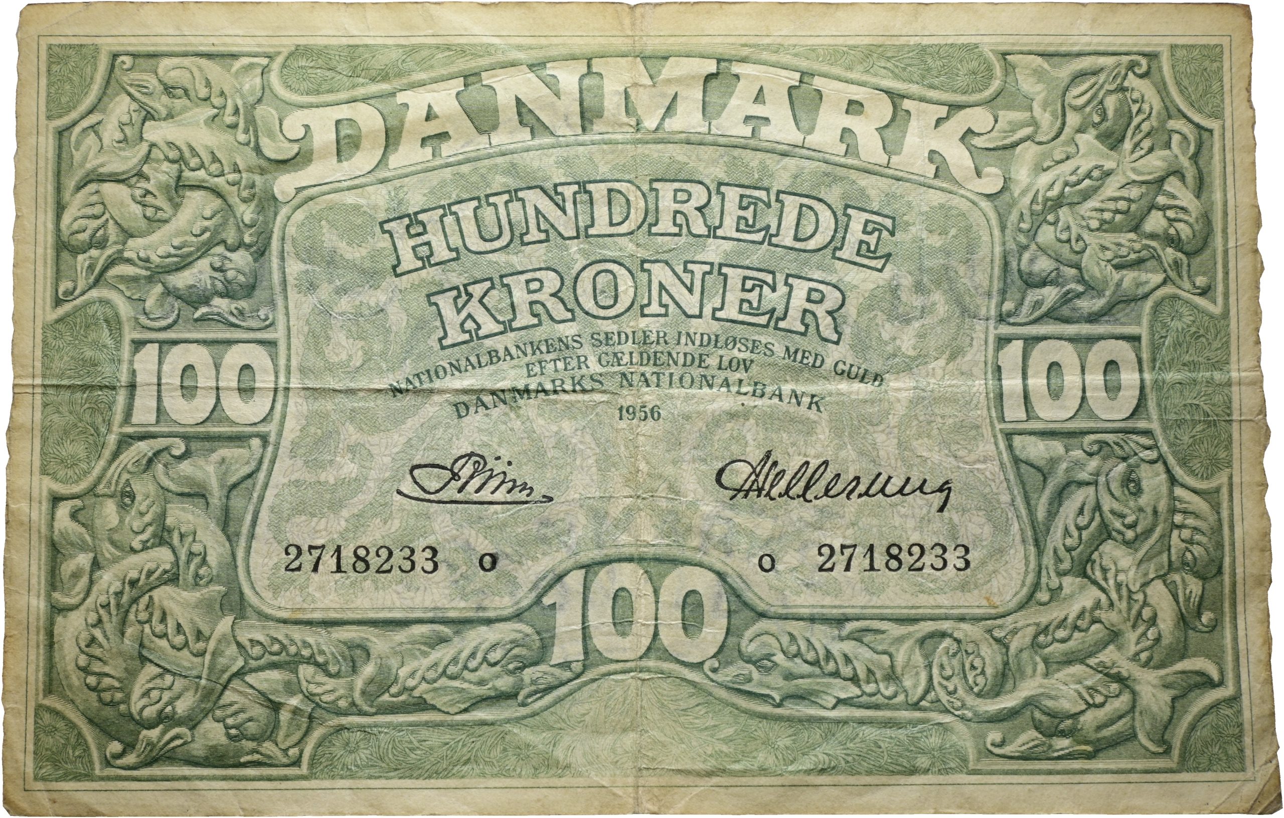 100 kroner 1956 o, nr 2718233, Riim / Hellerung, Sieg 126, Pick 39, kv. 1