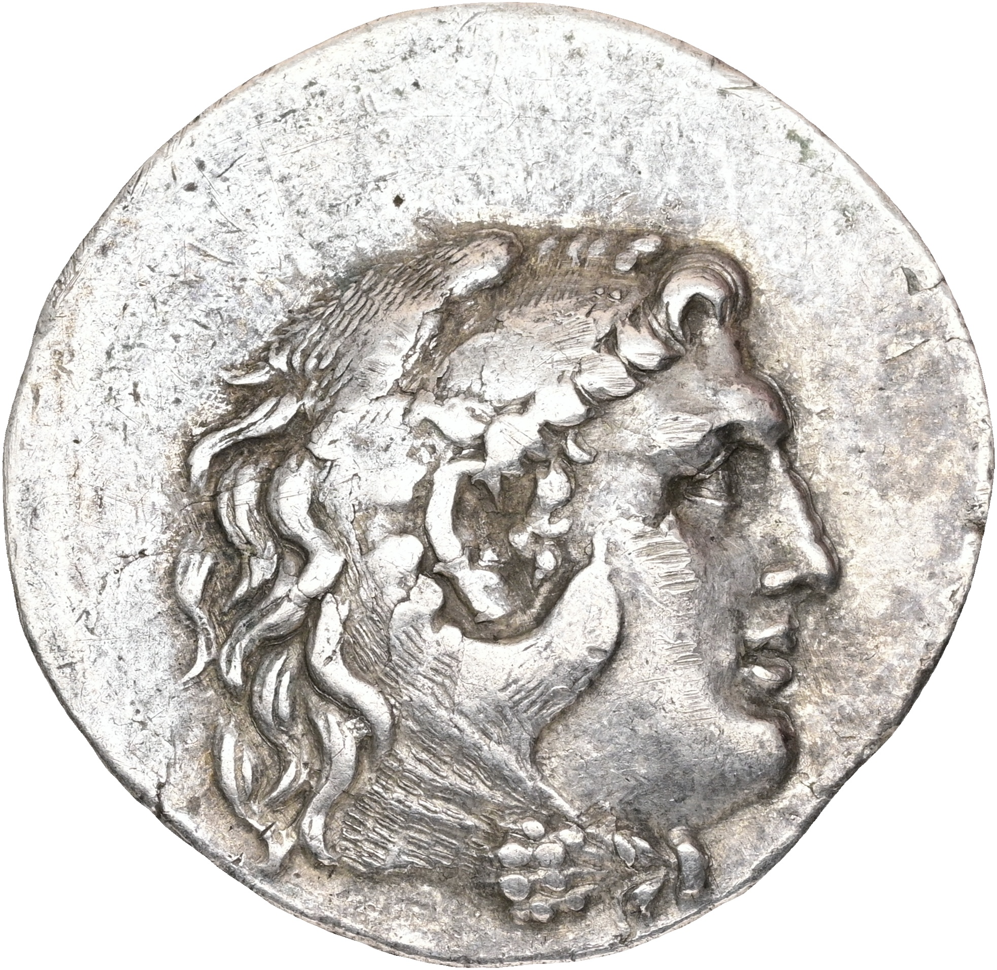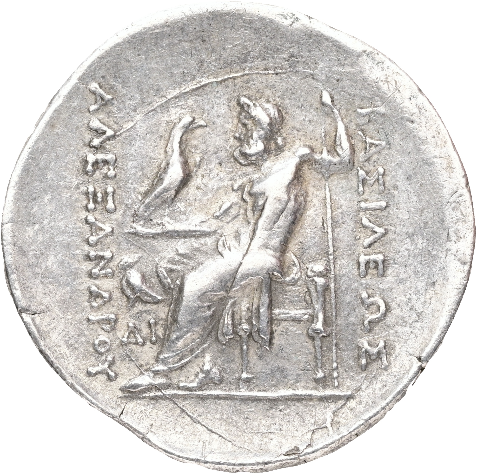 Ancient Greece, Thrace, Mesambria. Circa 225-175 BC. AR Tetradrachm (35.5 mm; 16.47 g). THRACE, Mesambria. Circa 225-175 BC. AR Tetradrachm (35.5 mm; 16.47 g). In the name and types of Alexander III of Macedon. Head of Heracles right, wearing lion skin headdress / Zeus Aëtophoros seated left, holding eagle in outstretched right hand and resting on scepter with left; to inner left, crested Corinthian helmet above ΔI. Some scuffs on obverse and several die-breaks on reverse. Toned.