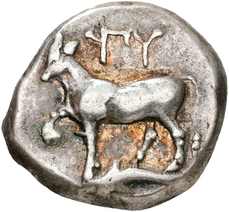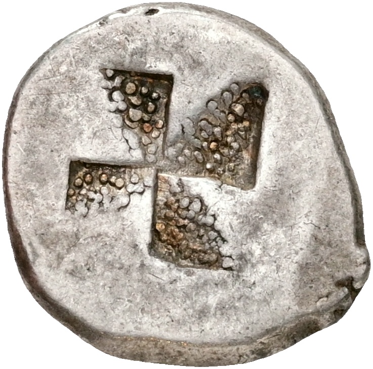 Ancient Greece, Thrace, Byzantion, c. 340-320 BC, Half Siglos. Bull standing left on dolphin left / Mill-sail pattern incuse. 2.44 g. HGC 3, 1390. EF-VF. Ex. Galata Coins, Wales, 12.10.1989.