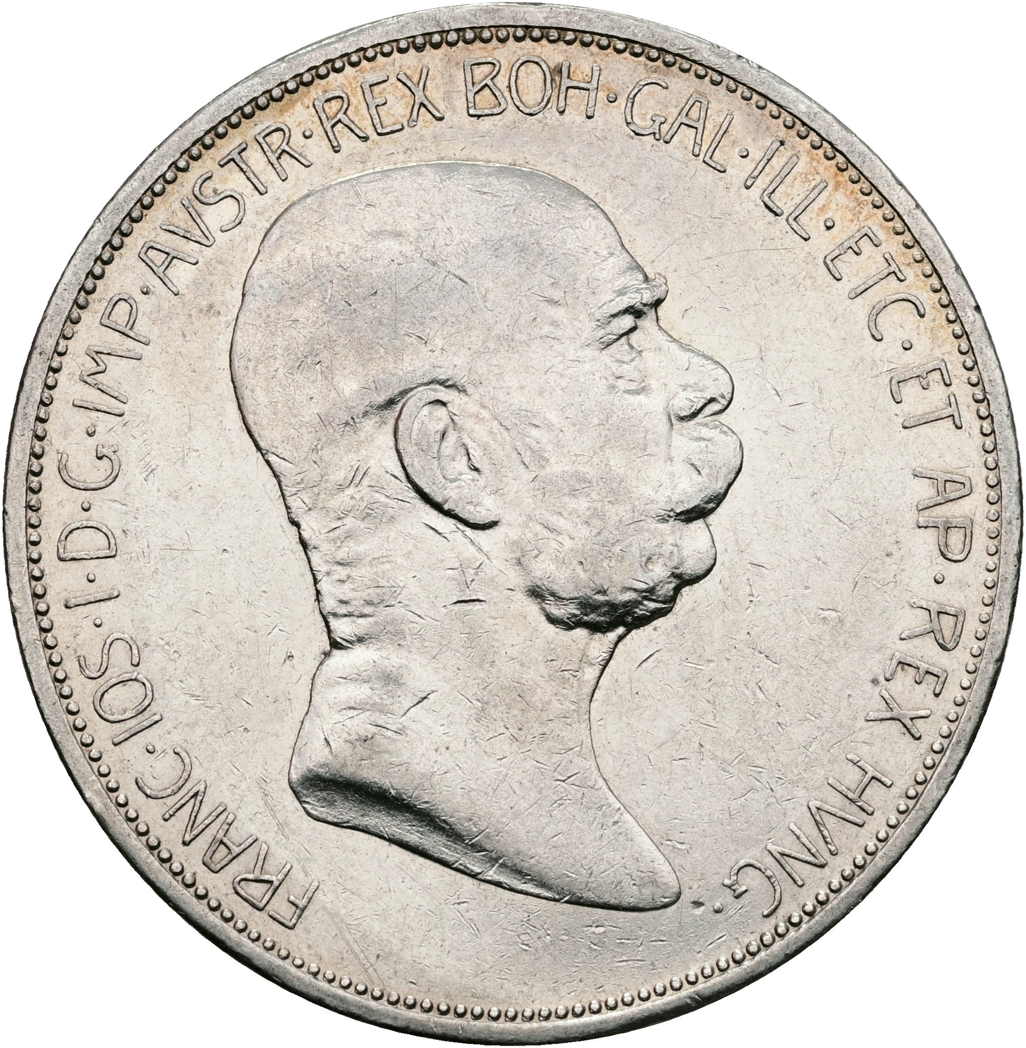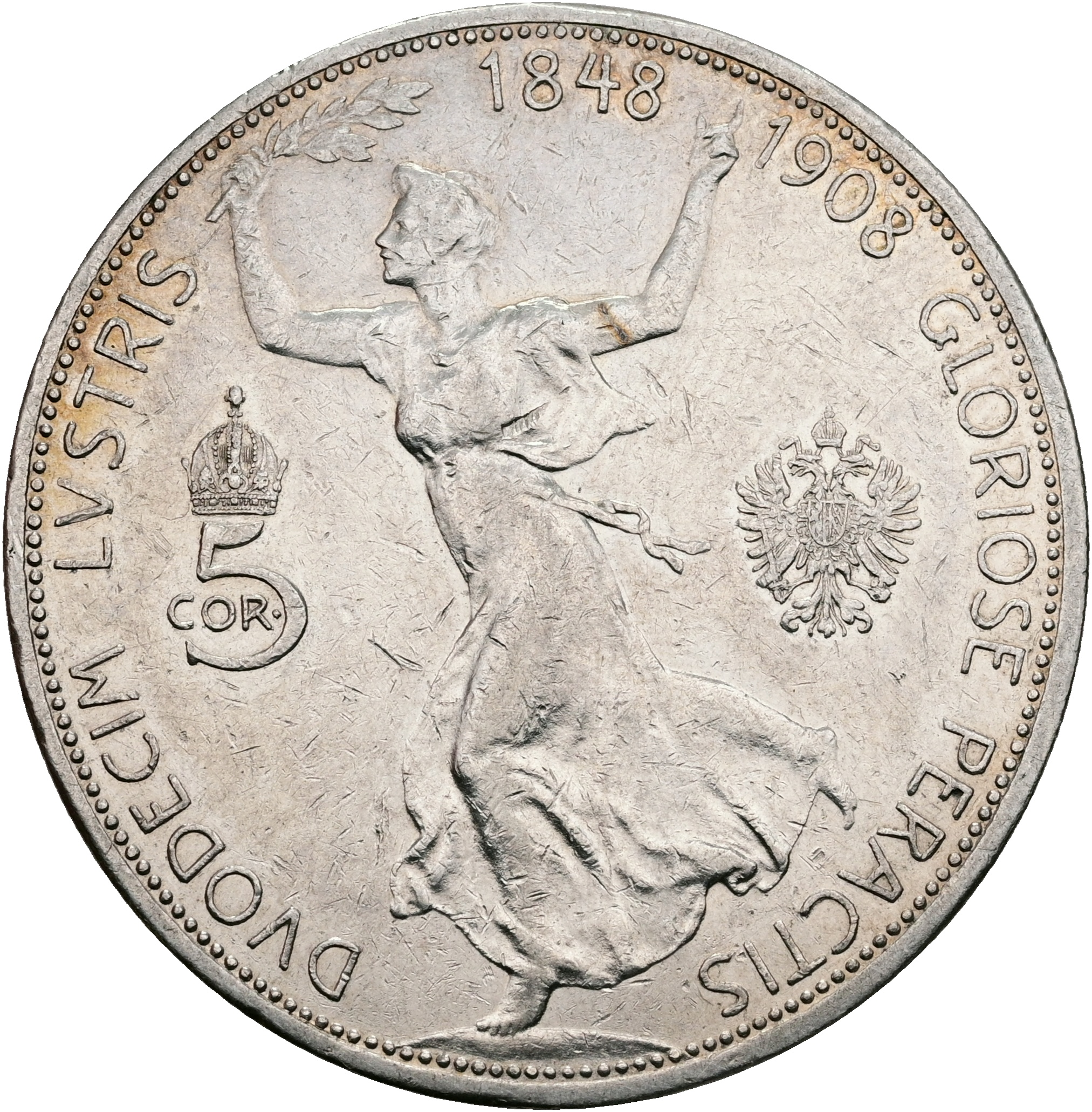 Austria, Franz Joseph I, 5 Corona 1908, KM 2809, VF, cleaned.