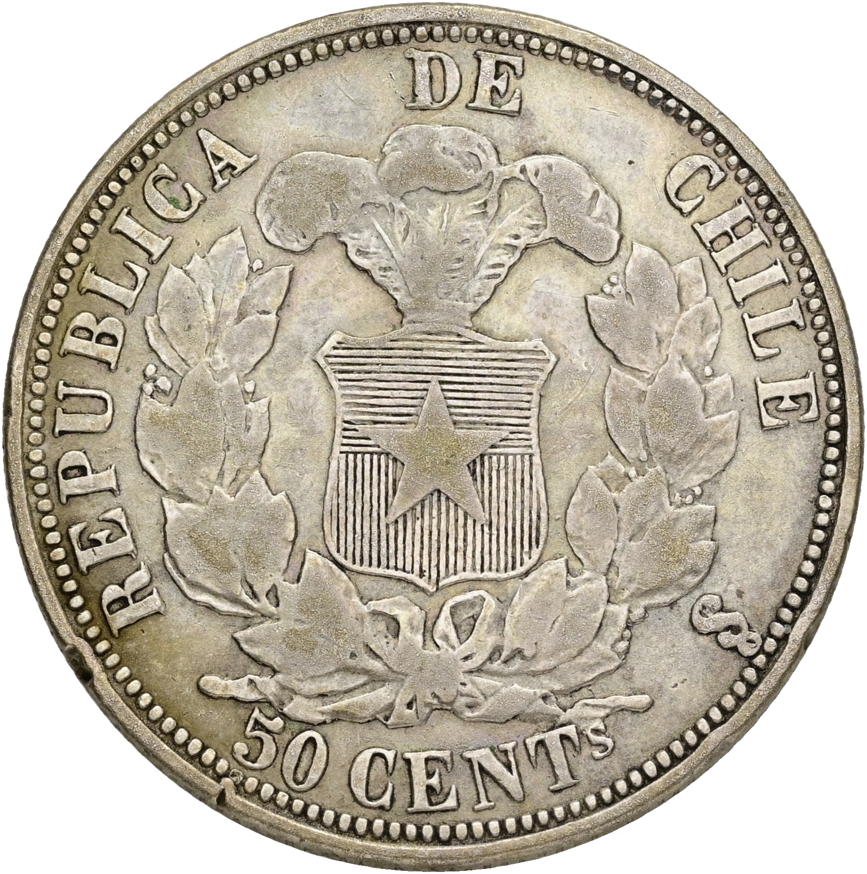 Chile, 50 Centavos 1865, KM 134, VF-F, edge nicks.