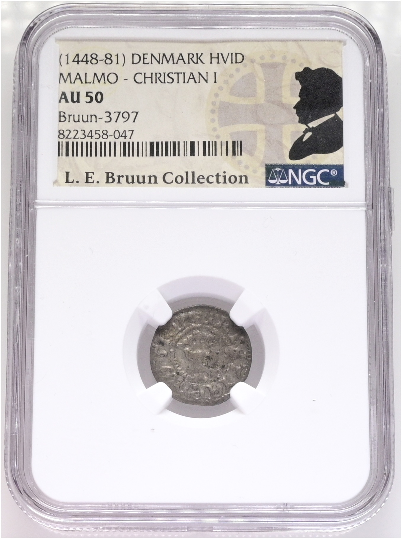 Christian I, Malmø, hvid u. år, 1.3, G 23C, LEB 3783, NGC AU 50, nydeligt eksemplar, ex. L.E. Bruun, original samleretiket medfølger. (Kopier)