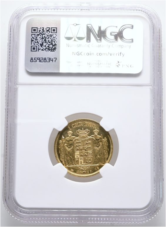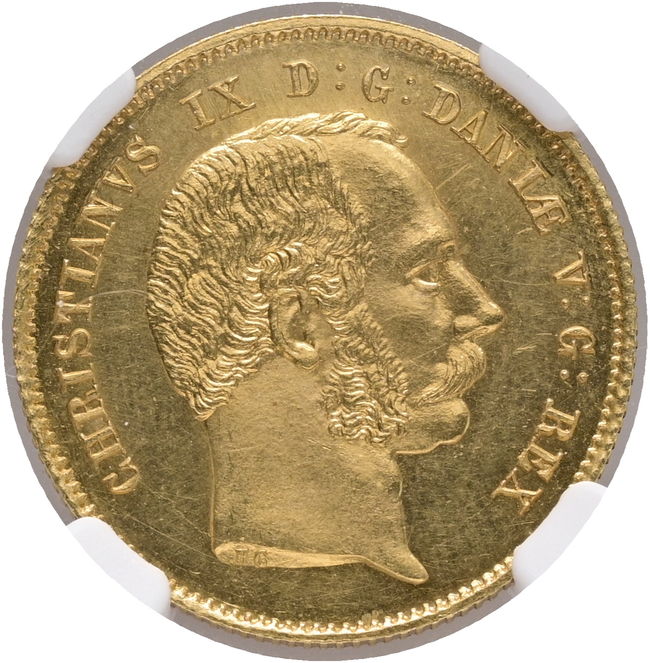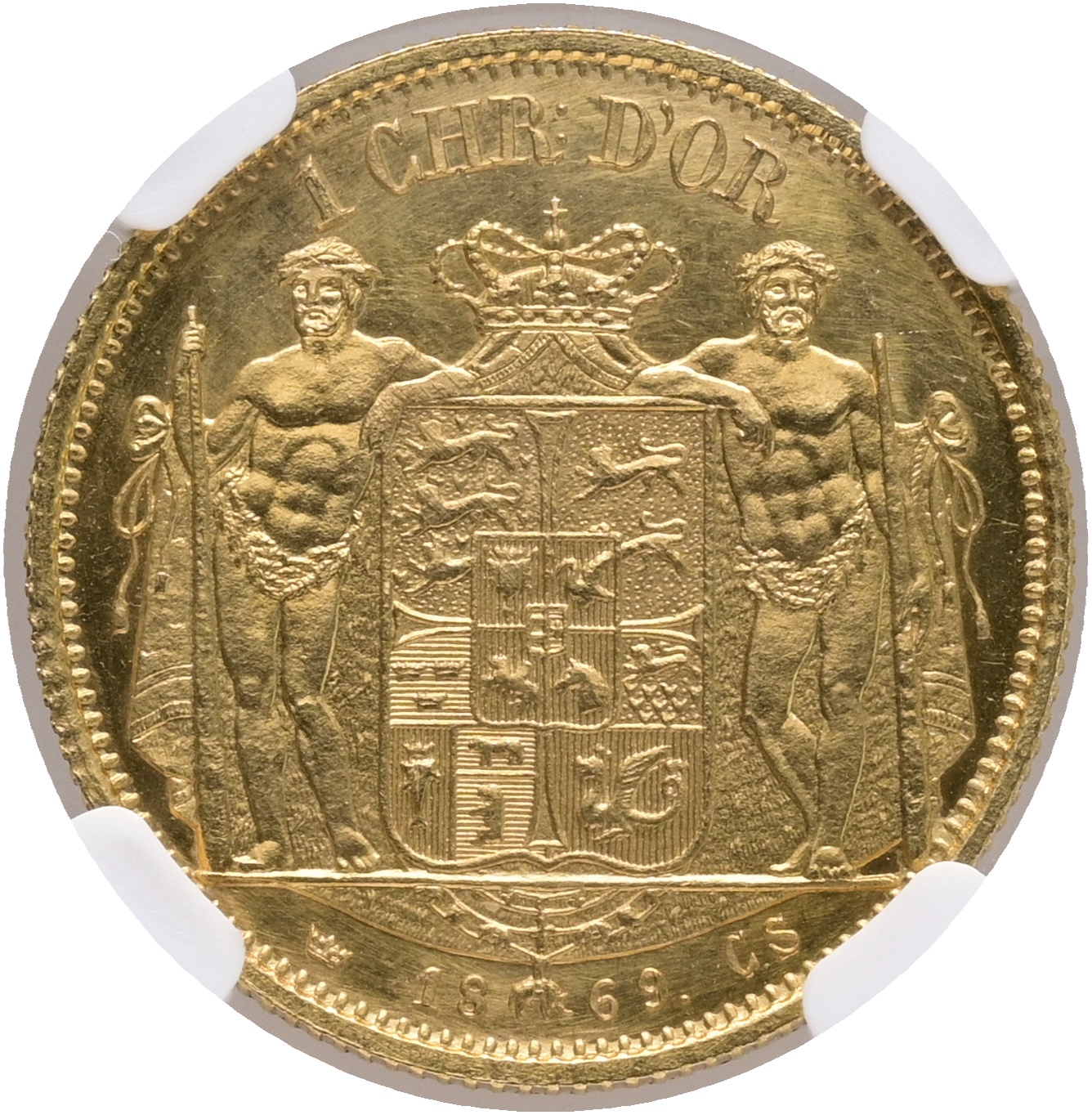 Christian IX (1863-1906), Christian d’or 1869, København, H 2, Sieg 6, graderet MS 63 af NGC. Danmarks sjældneste d’or-type produceret i kun 539 eksemplarer, hvoraf de 500 var til Kongehuset. Udmøntningen foregik fra den 28. juni til den 3. juli 1869.