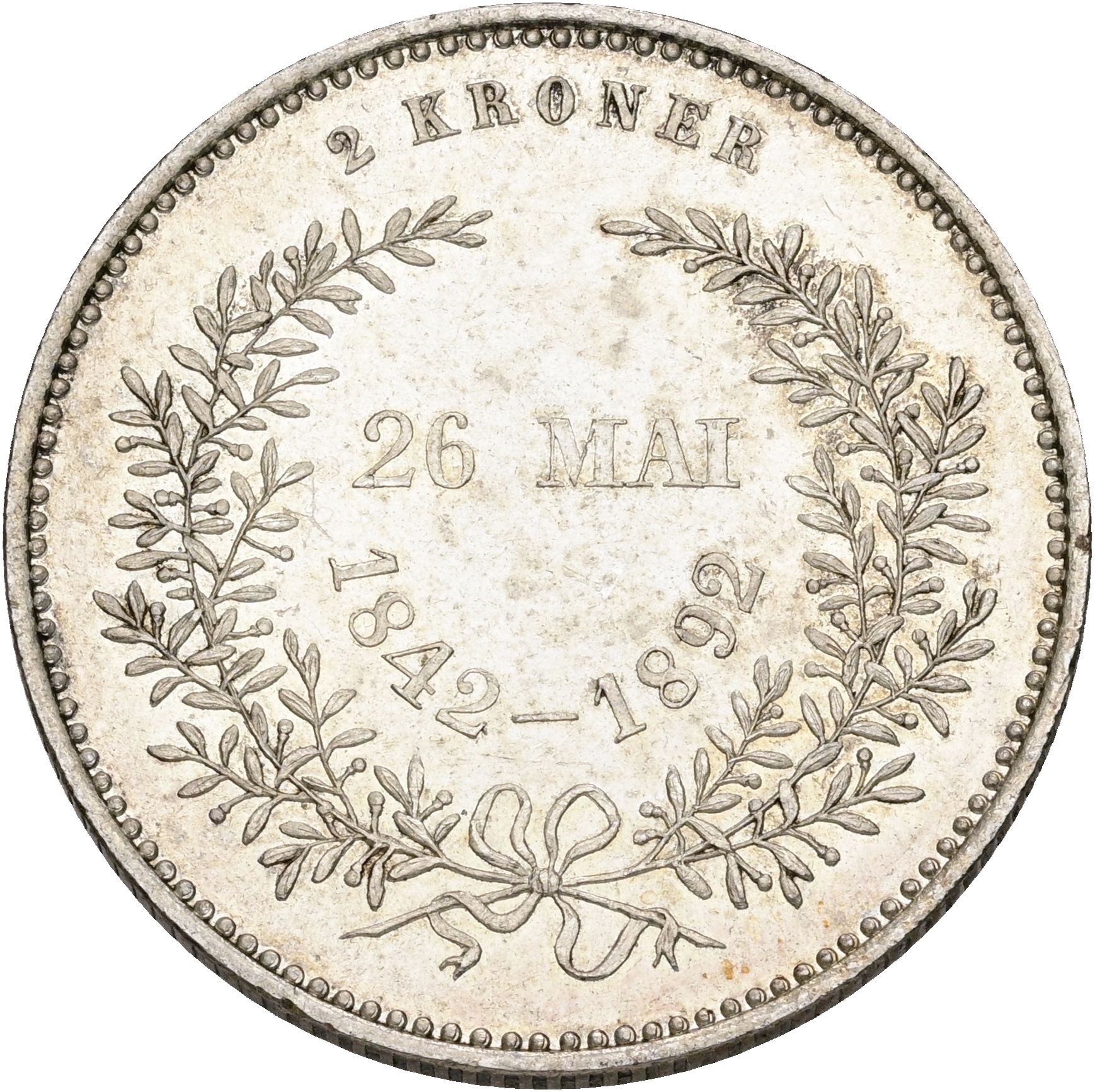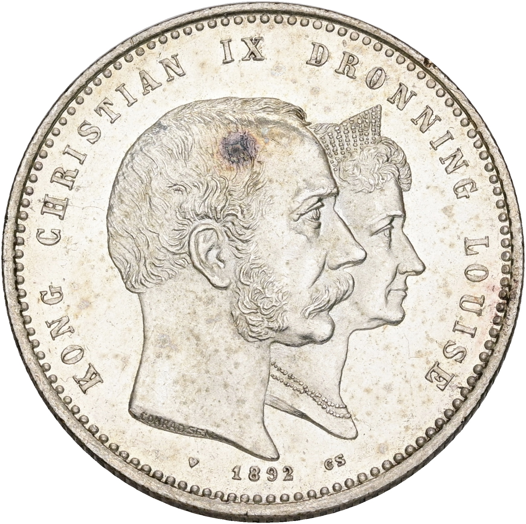 Christian IX, 2 kroner 1892, Kongeparrets guldbryllup, Sieg 2, H 11, kv. M-0, håndteringsspor.