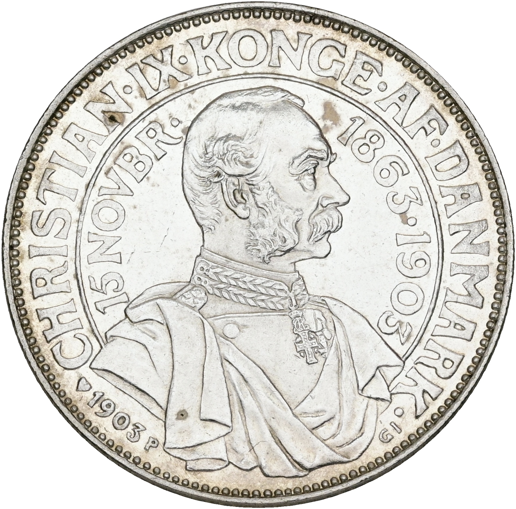 Christian IX, 2 kroner 1903, 40-års regeringsjubilæum, Sieg 3, H 12, kv. 0-01, pletter, medaljeprægskarakter.