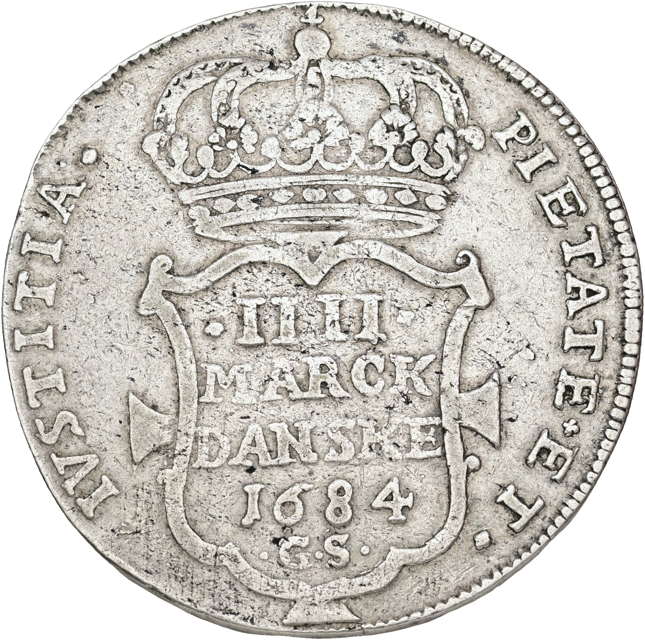 Christian V, krone 1684, Sieg 41.1, H 79, Aagaard 34, ridser i højre felt på avers, ks, ellers et fint eksemplar af denne sjældne variant med indbuet skjold og bemærkelsesværdig stor diameter (40 mm), kv. 1+-1