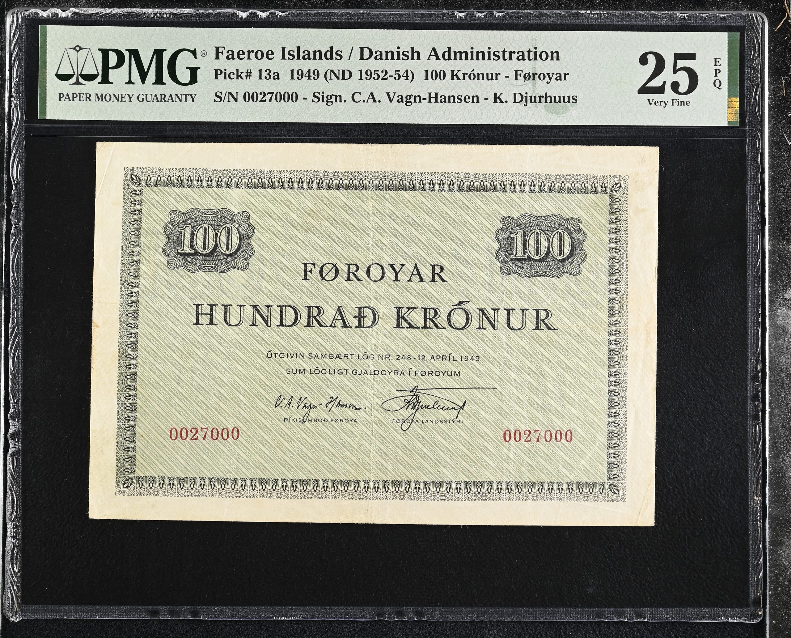 Færøerne / Faroe Islands, 100 krónur u. år (1952), nr. 0027000, C. A. Vagn-Hansen / kr. Djurhuus, Sieg 19, Pick 19, PMG 25 Very Fine – Exceptional Paper Quality.