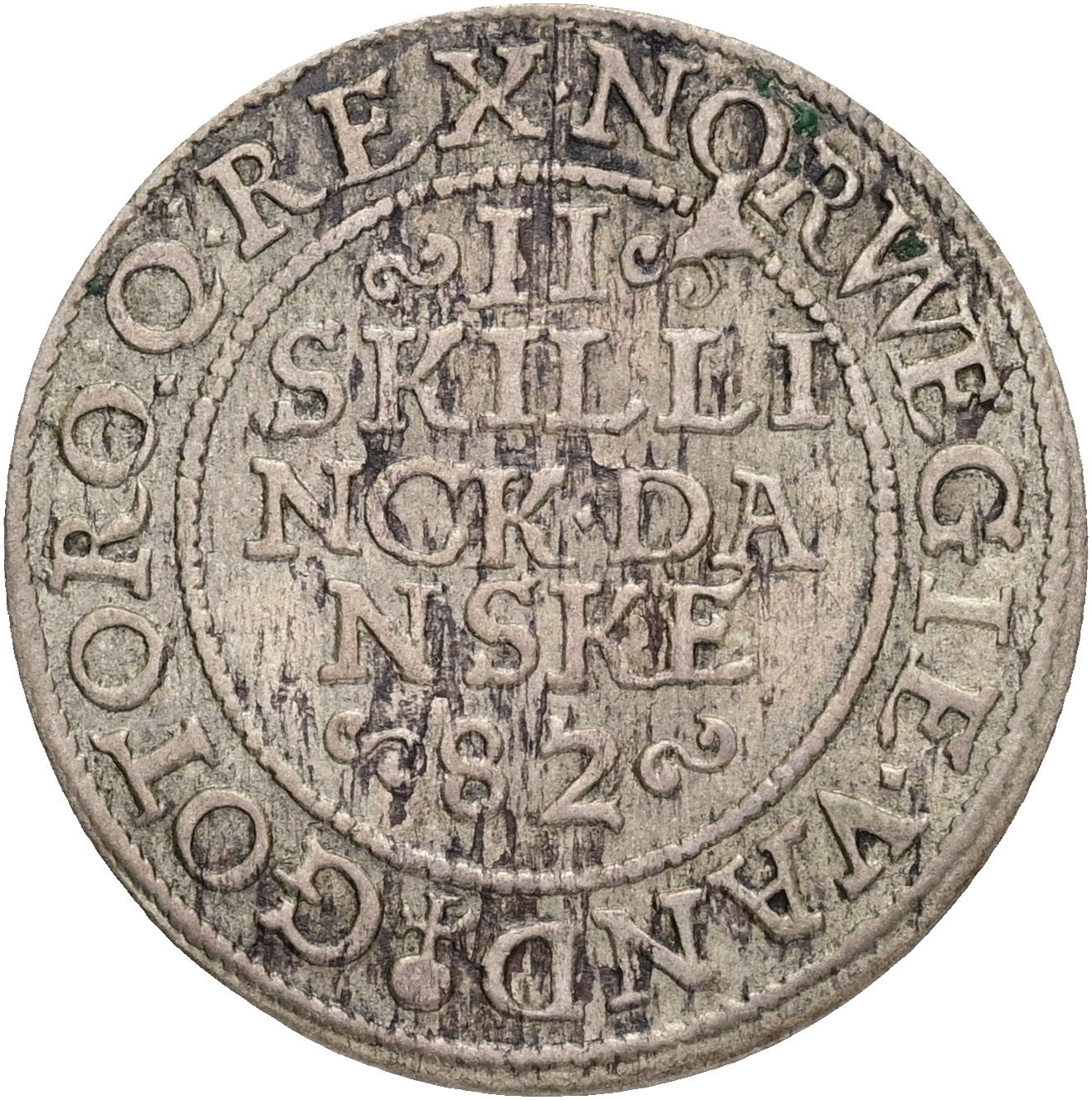 Frederik II, 2 Skilling 1582, Sieg 8, H 27, kv. 1+, let korr.