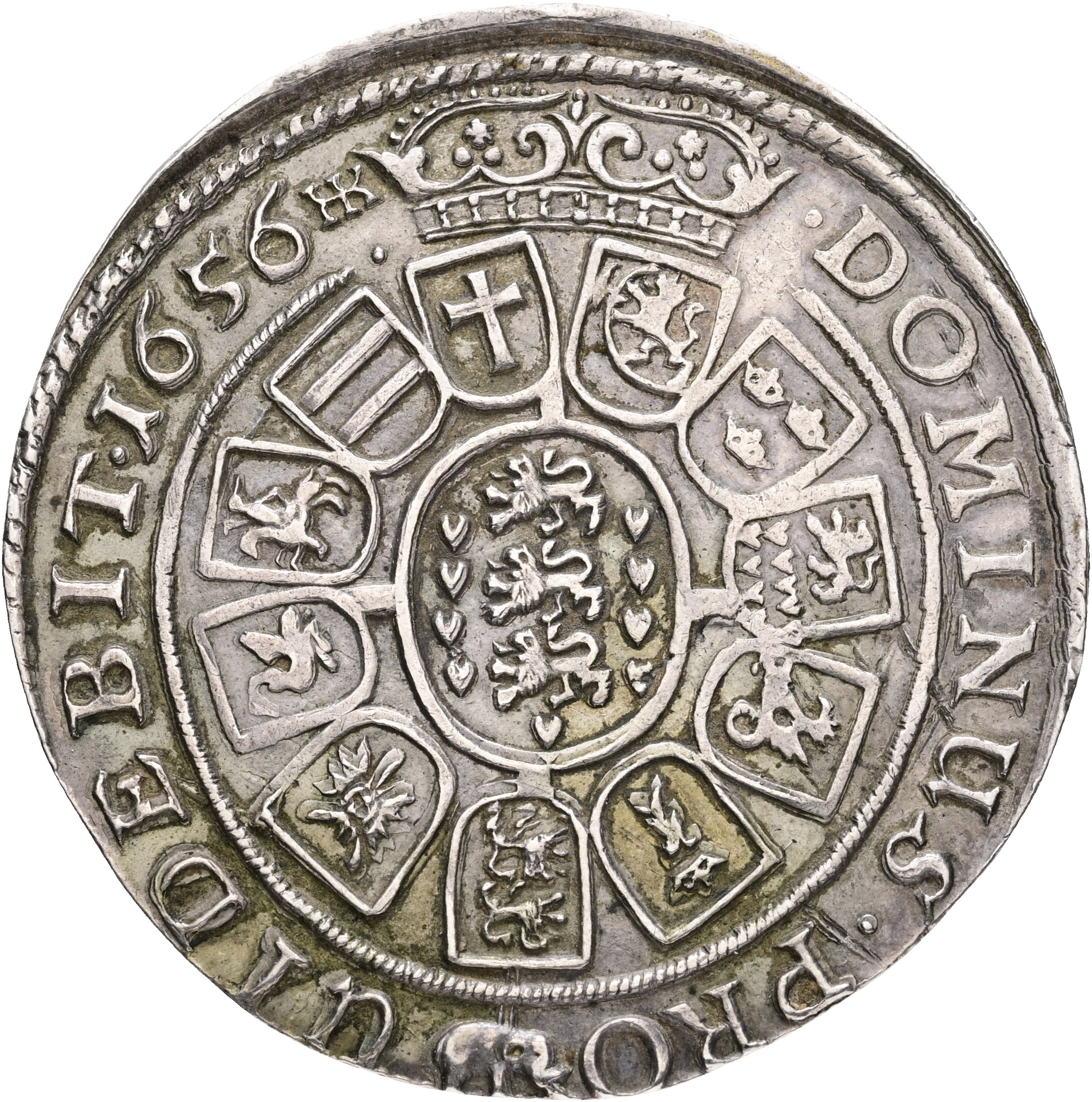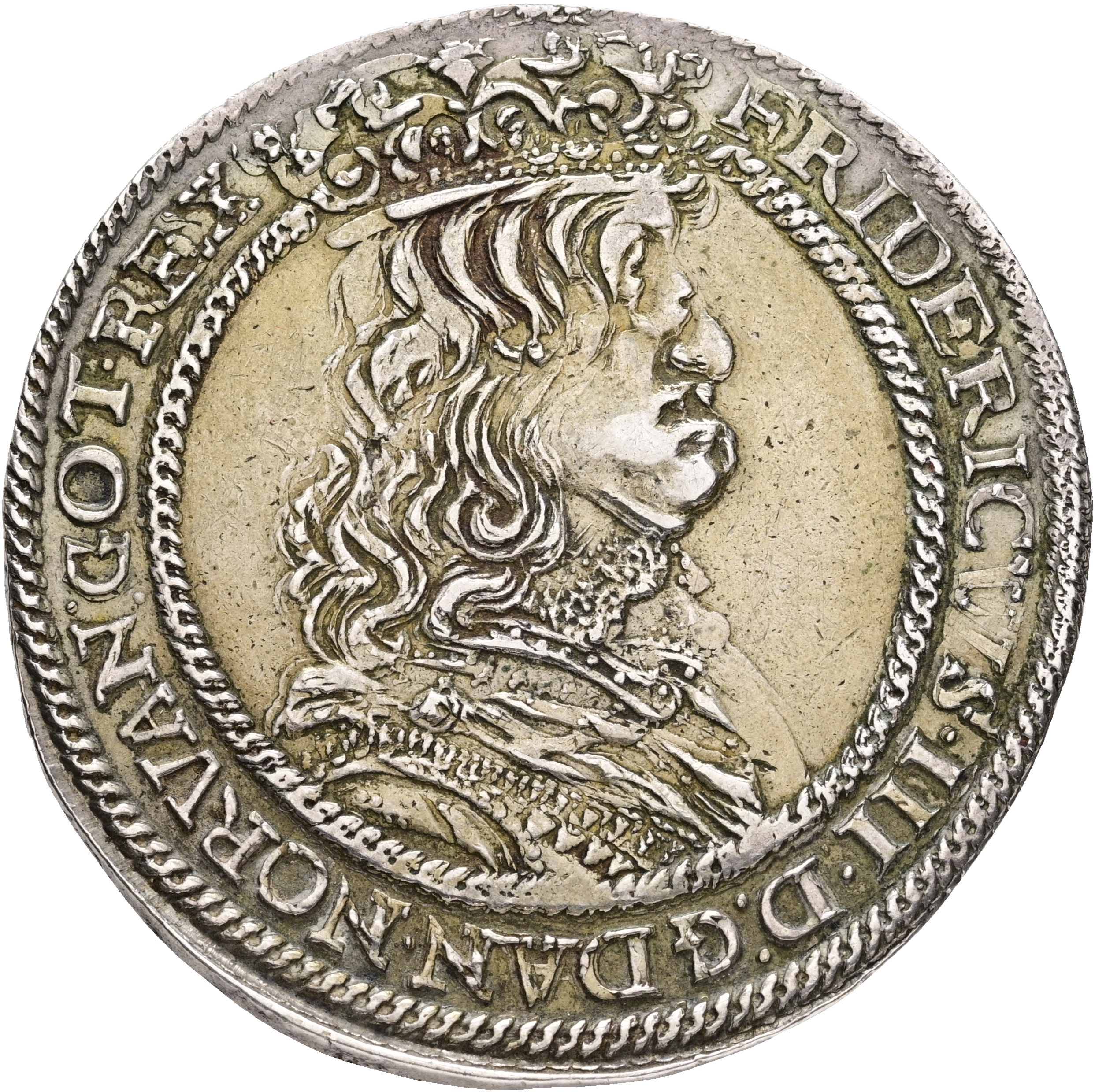 Frederik III, speciedaler 1656, Sieg 73.1, H 54A , Aagaard 83.2, svage spor af forgyldning, kv. 1+, Ex. Oslo Myntgalleri 4, 11.05.2014, lot 1248, etiket medfølger; Ex. Oslo Mynthandel 61, 30.11.2008, lot 1160.