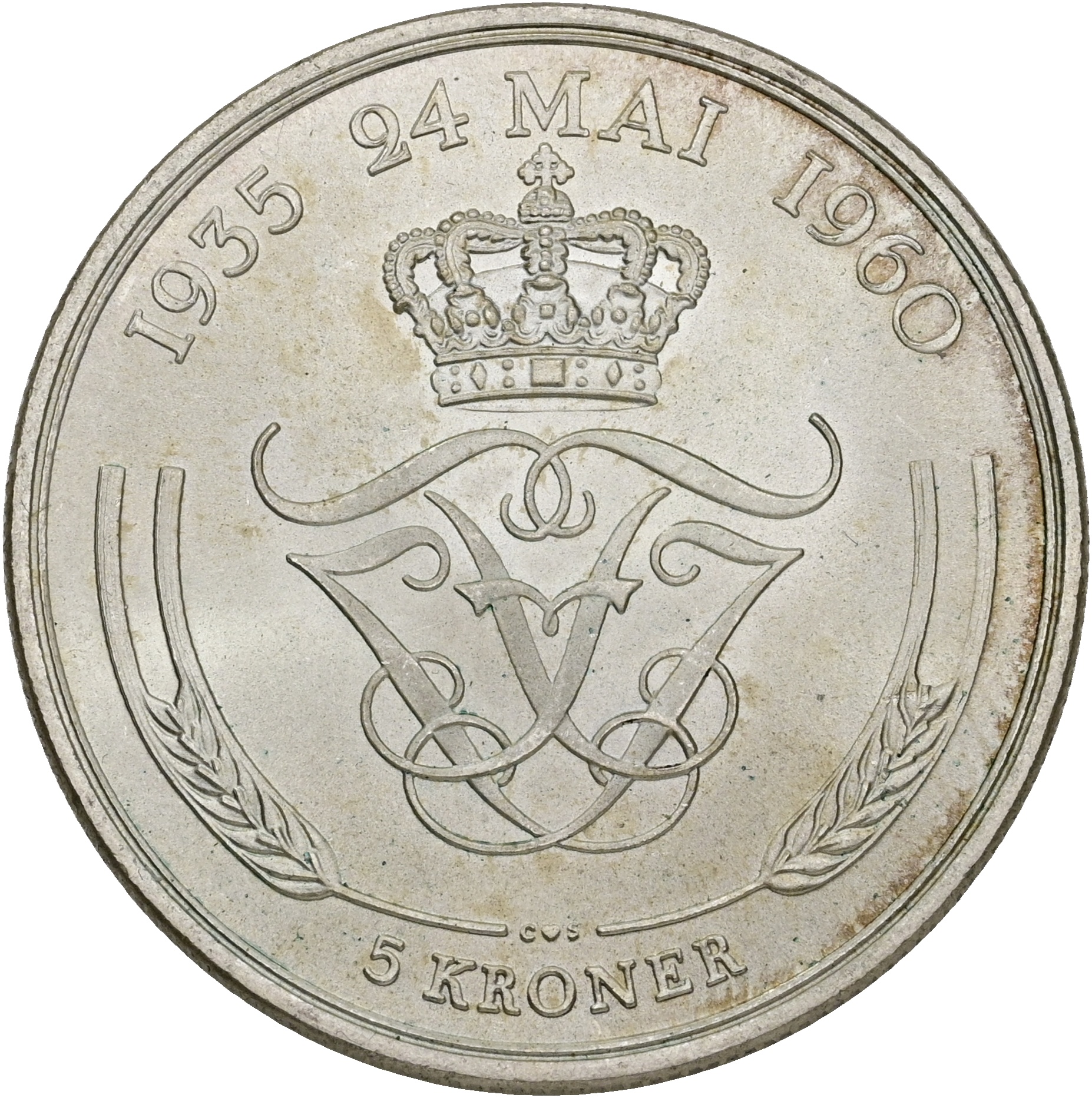 Frederik IX, 5 kroner 1960, kongeparrets sølvbryllup, Sieg 12, H 1, kv. 0