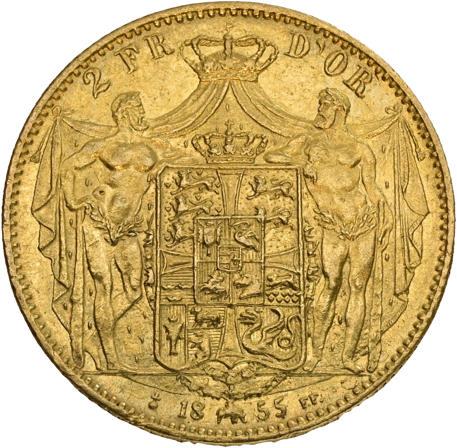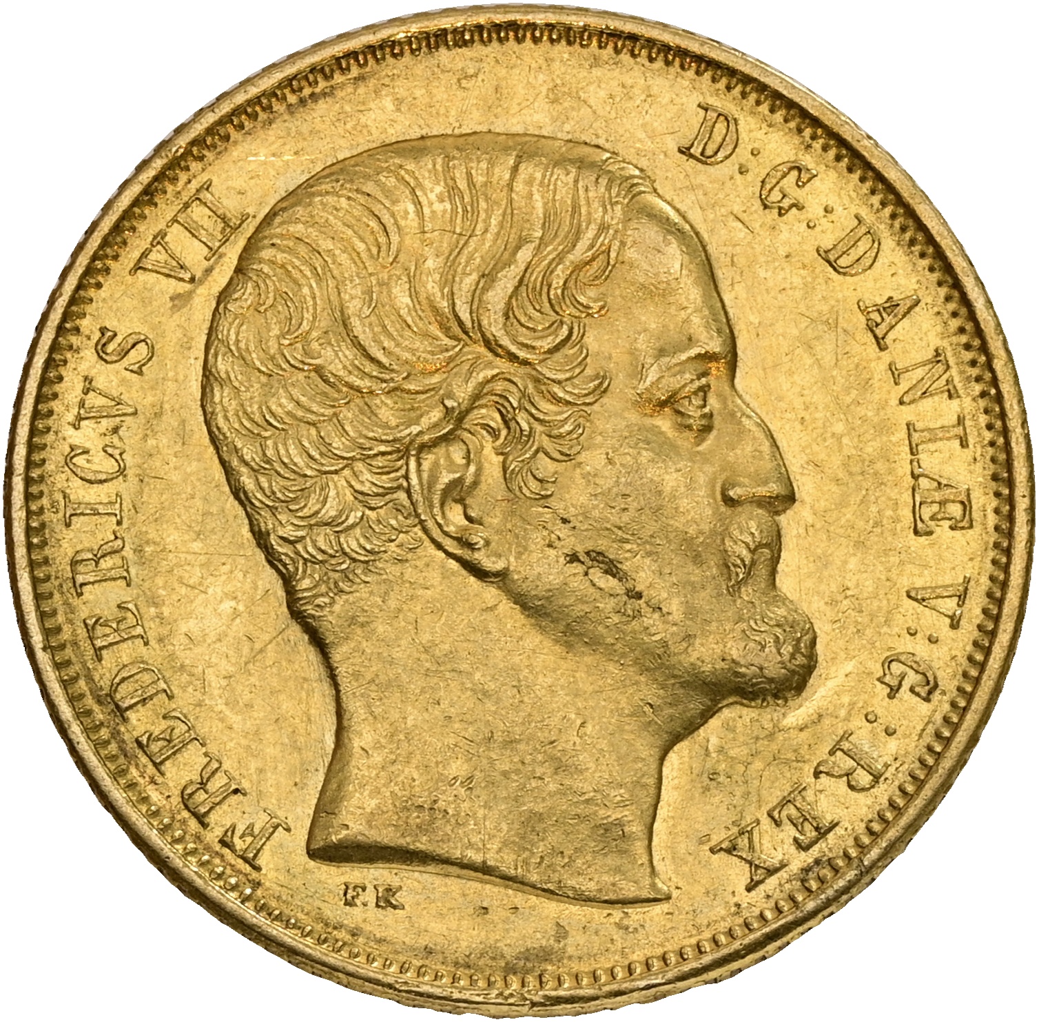 Frederik VII (1848-1863), 2 Frederik d’or 1855, Sieg 16.2, H 1B, kv. 01, lille blanketfejl på advers – fint eksemplar af uhyre sjældent årstal