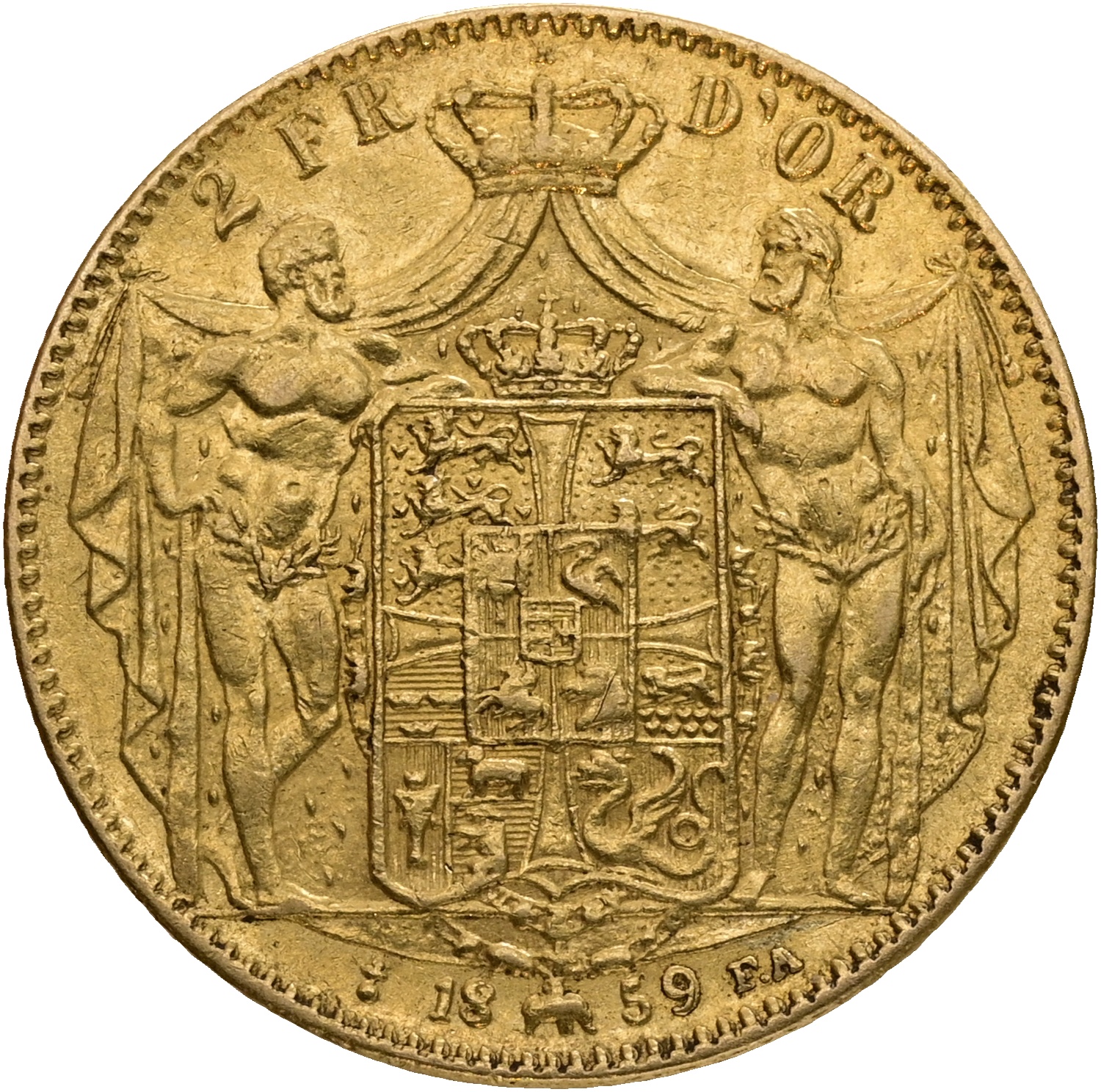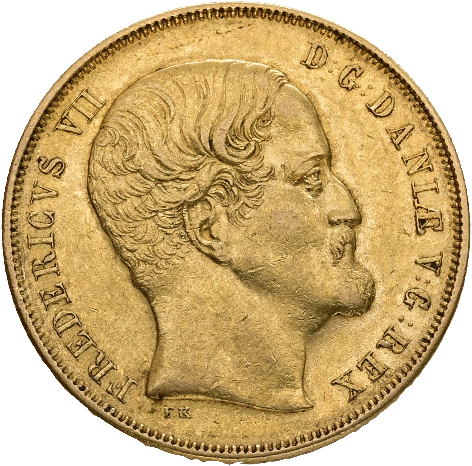 Frederik VII (1848-1863), Altona, 2 Frederik d’or 1859 FF, H 1C, Sieg 16.3, F 291, kv. 1+. Ex. Thomas Høiland 88, 08.11.2005, lot 3133. Fint eksemplar med en del møntskær, sjældent årstal.