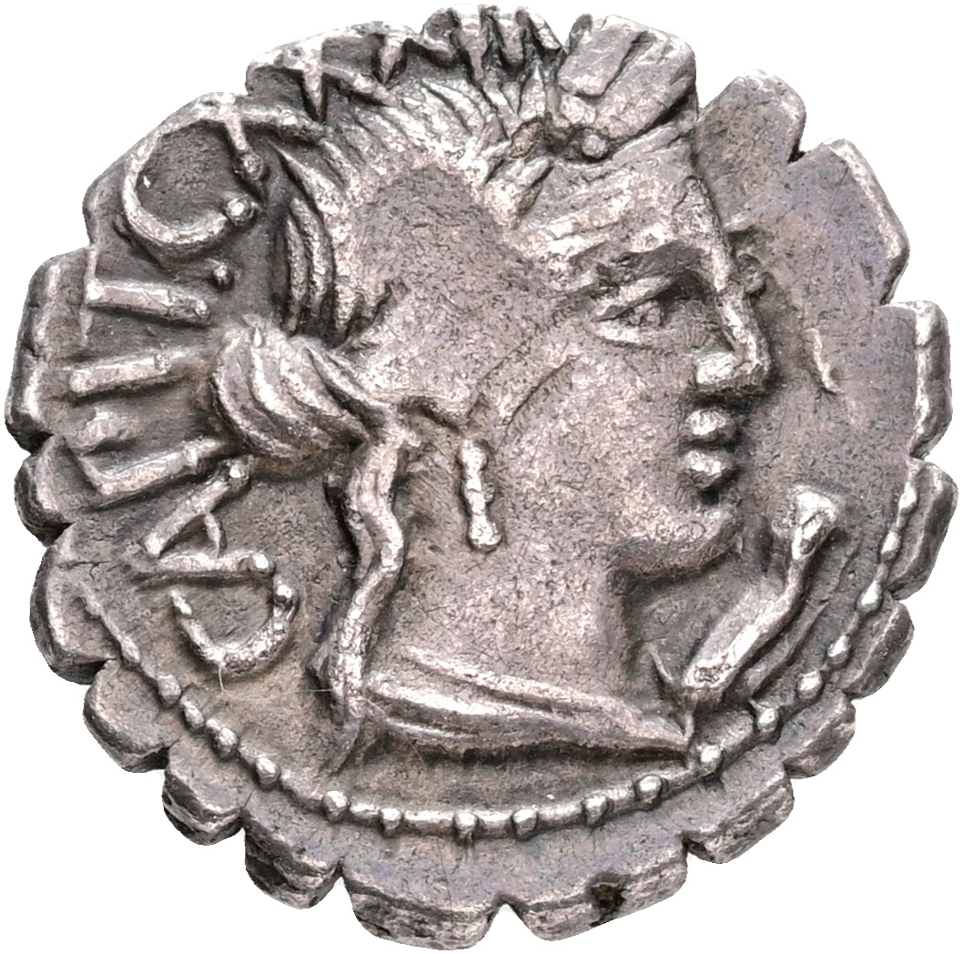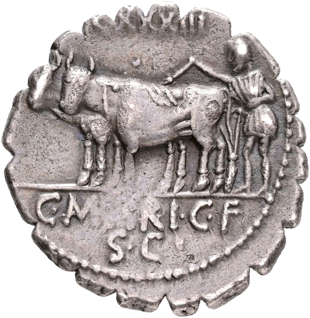 Roman Republic, C. Marius C. f. Capito. Rome, Serrate Denarius, 81 BC. Obv: draped bust of Ceres right; CAPIT•XXXXIII behind (control numeral) behind, prow-stem (control mark) below chin. Rev: ploughman with yoke of oxen left; XXXXIII above, C•MARI•C•F S•C in two lines in exergue. 3.94 g. Crawford 378/1c. VF. Ex. B. Ahlström Mynthandel AB at Coin Fair in Copenhagen, 06.11.1993.