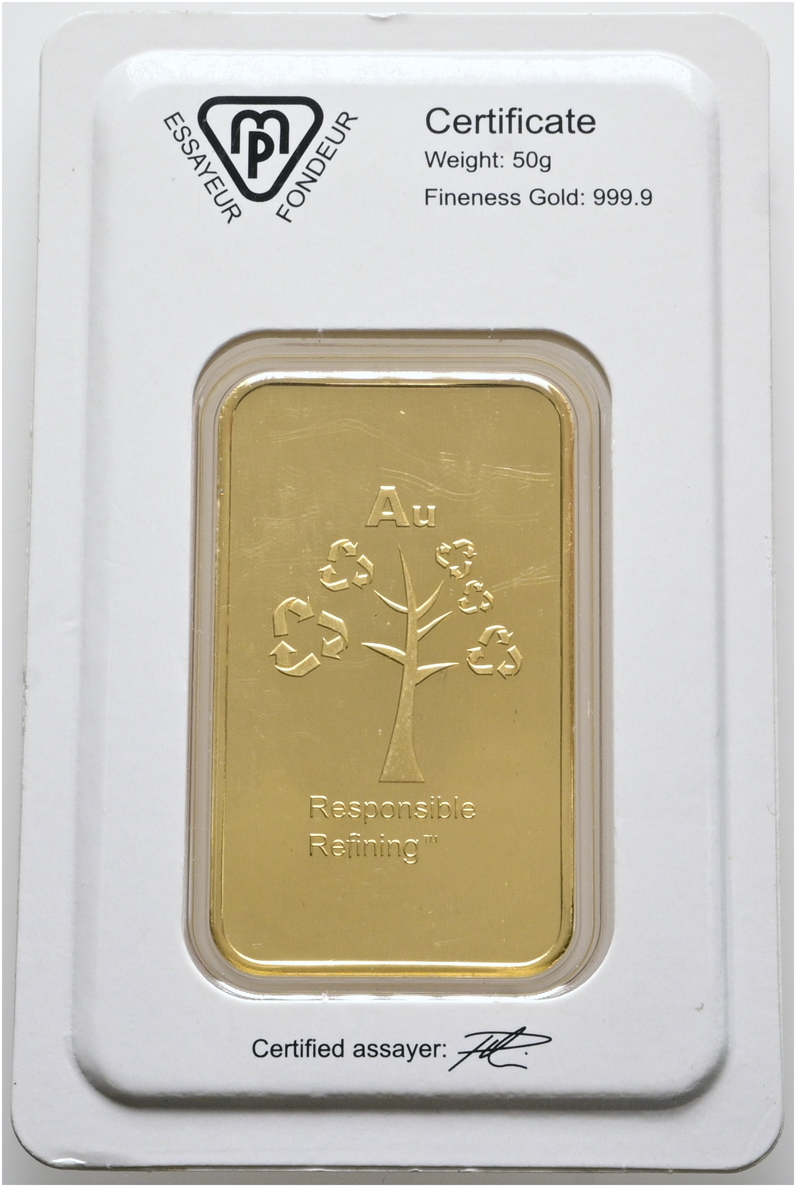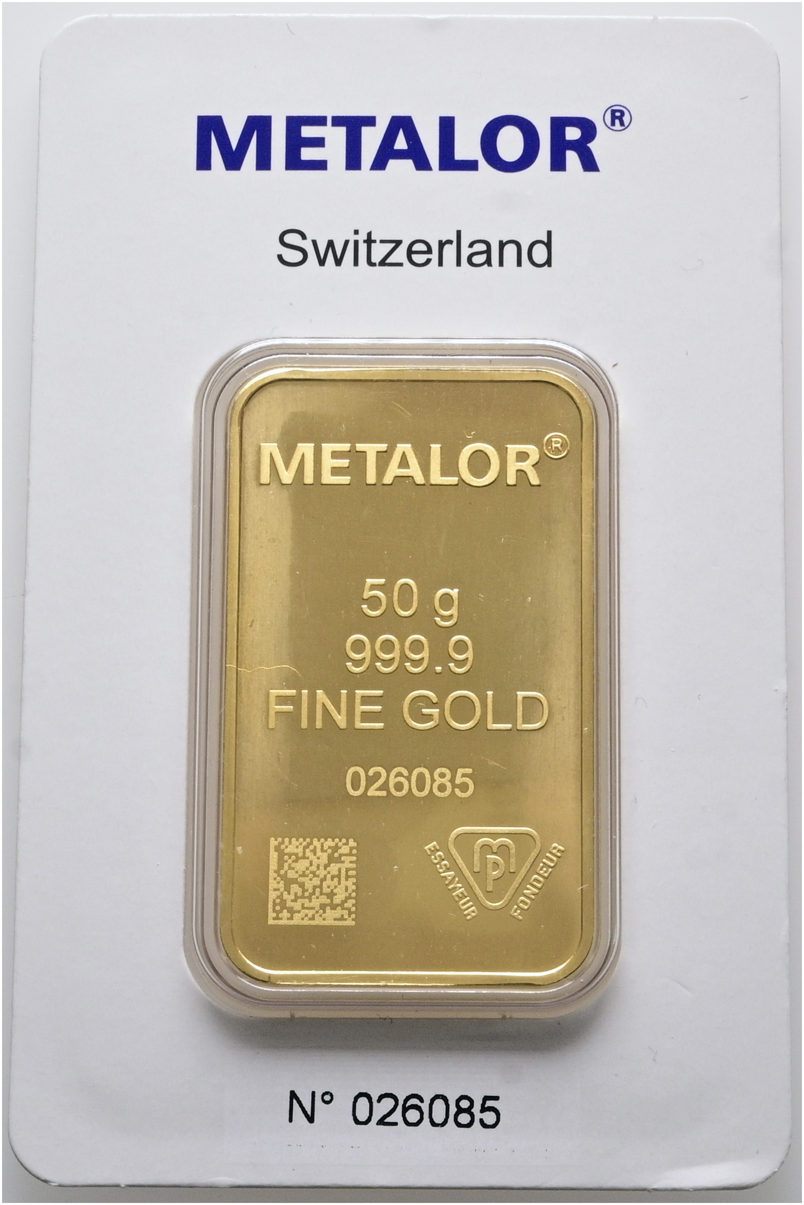 Guldbarre, 50 g, Au (999.9/1000), Metalor – i original holder.