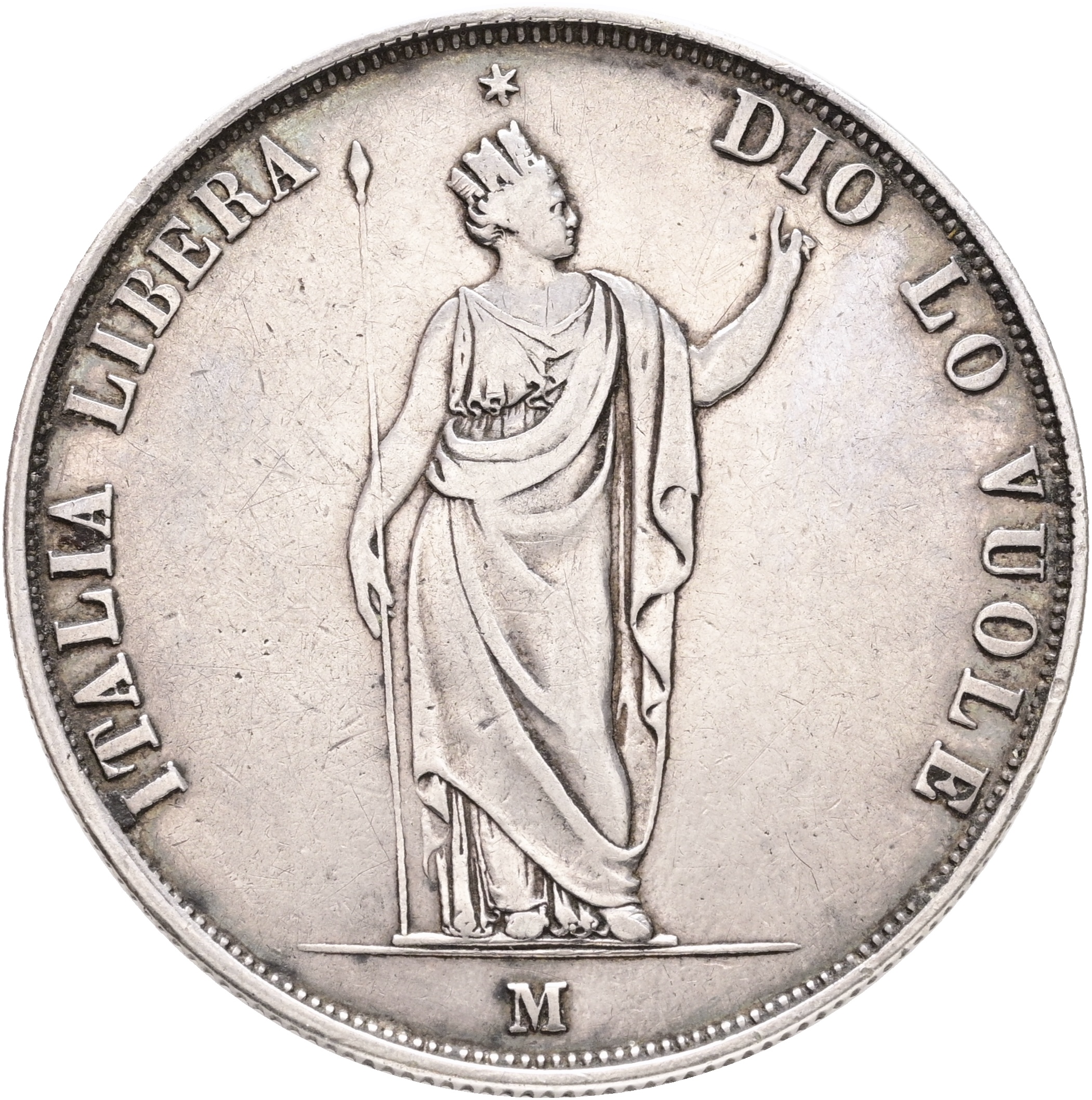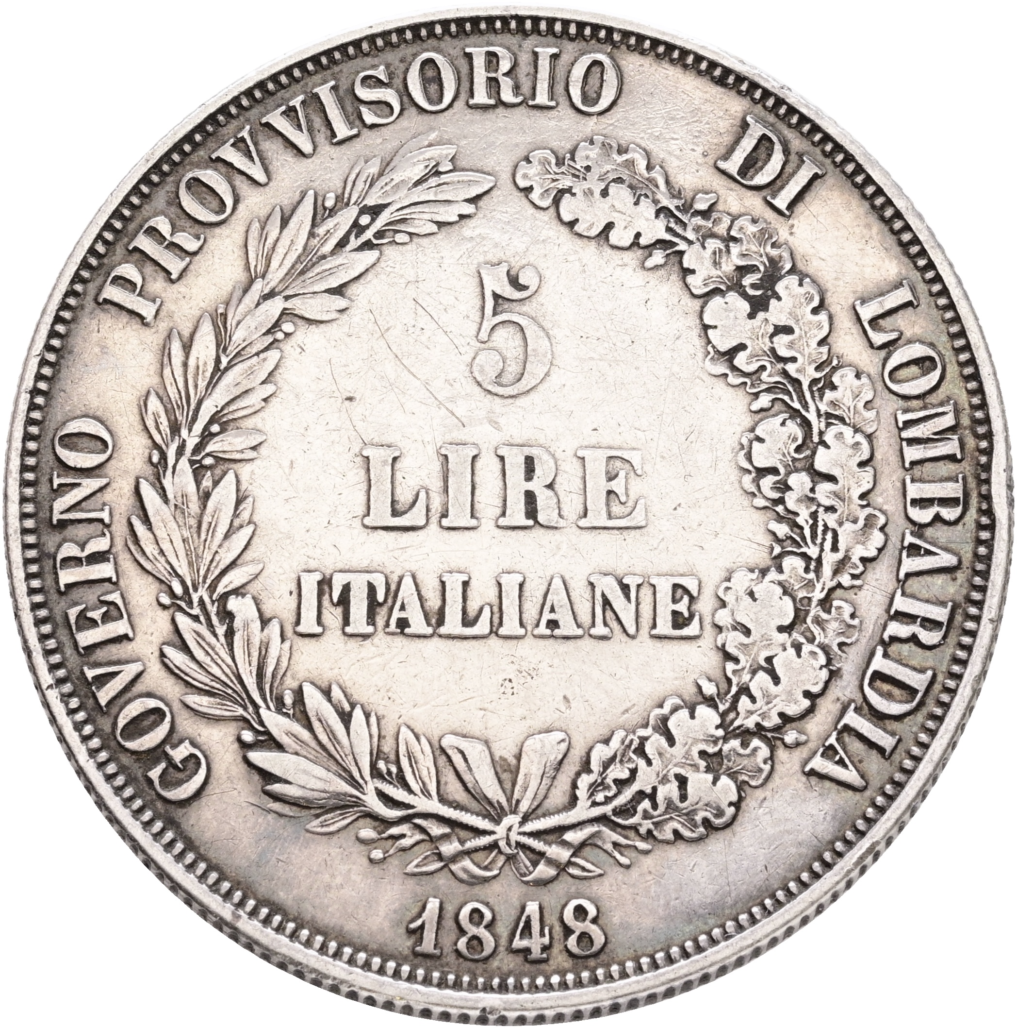 Italy, Lombardy. 5 Lire 1848 M, C 22, VF, lightly cleaned.