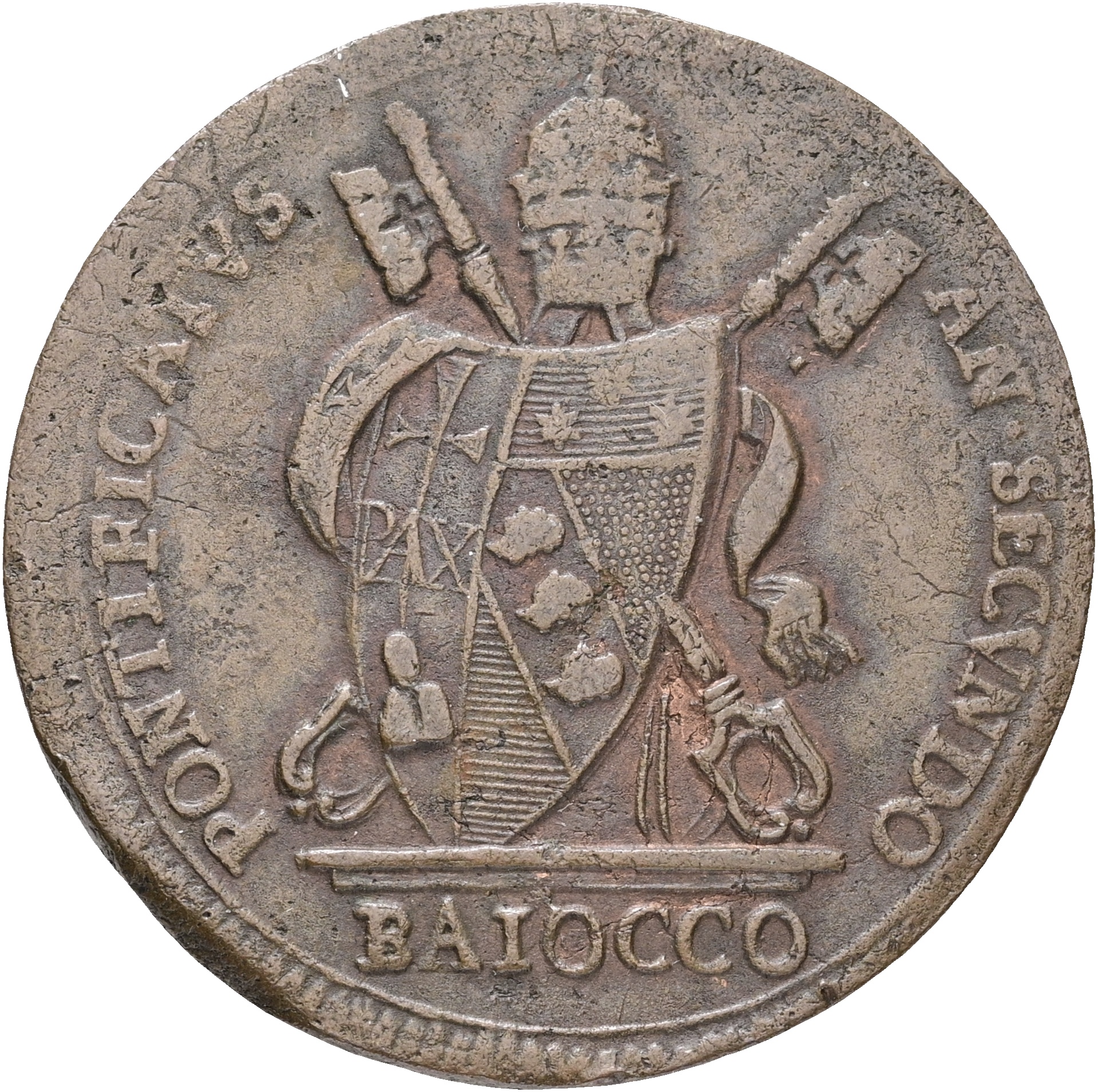 Papal States, Pius VI, 2 Baiocchi Romani ND (1772), KM 1226.1, VF-F, spots/corr.