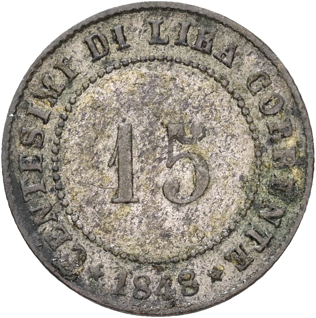 Italy, Republic of San Marco, 15 Centesimi 1848 ZV, KM 801, VF, remnants of tape.