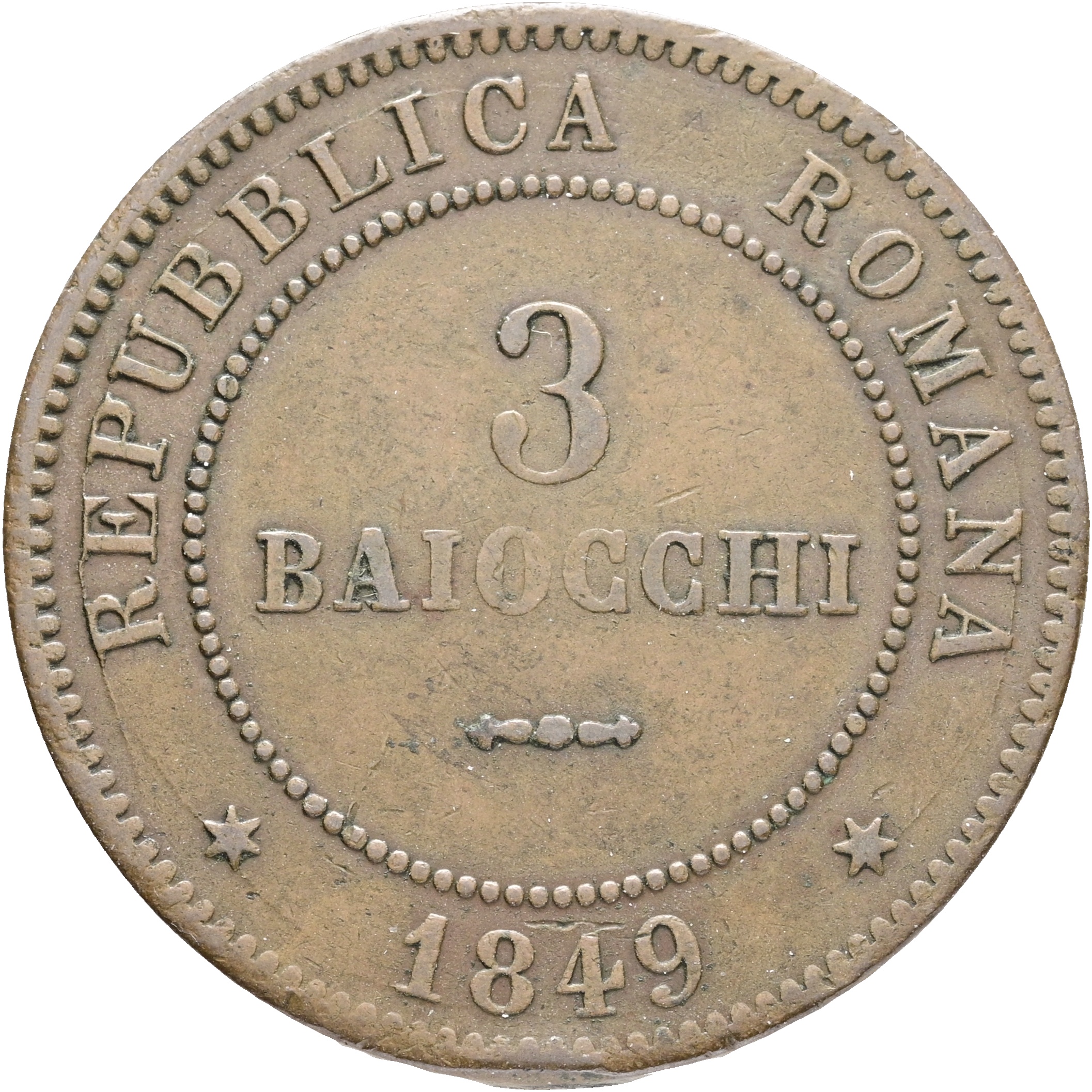 Italy, Roman Republic, 3 Baiocchi 1849 R, KM 23.1, VF, edge nicks.