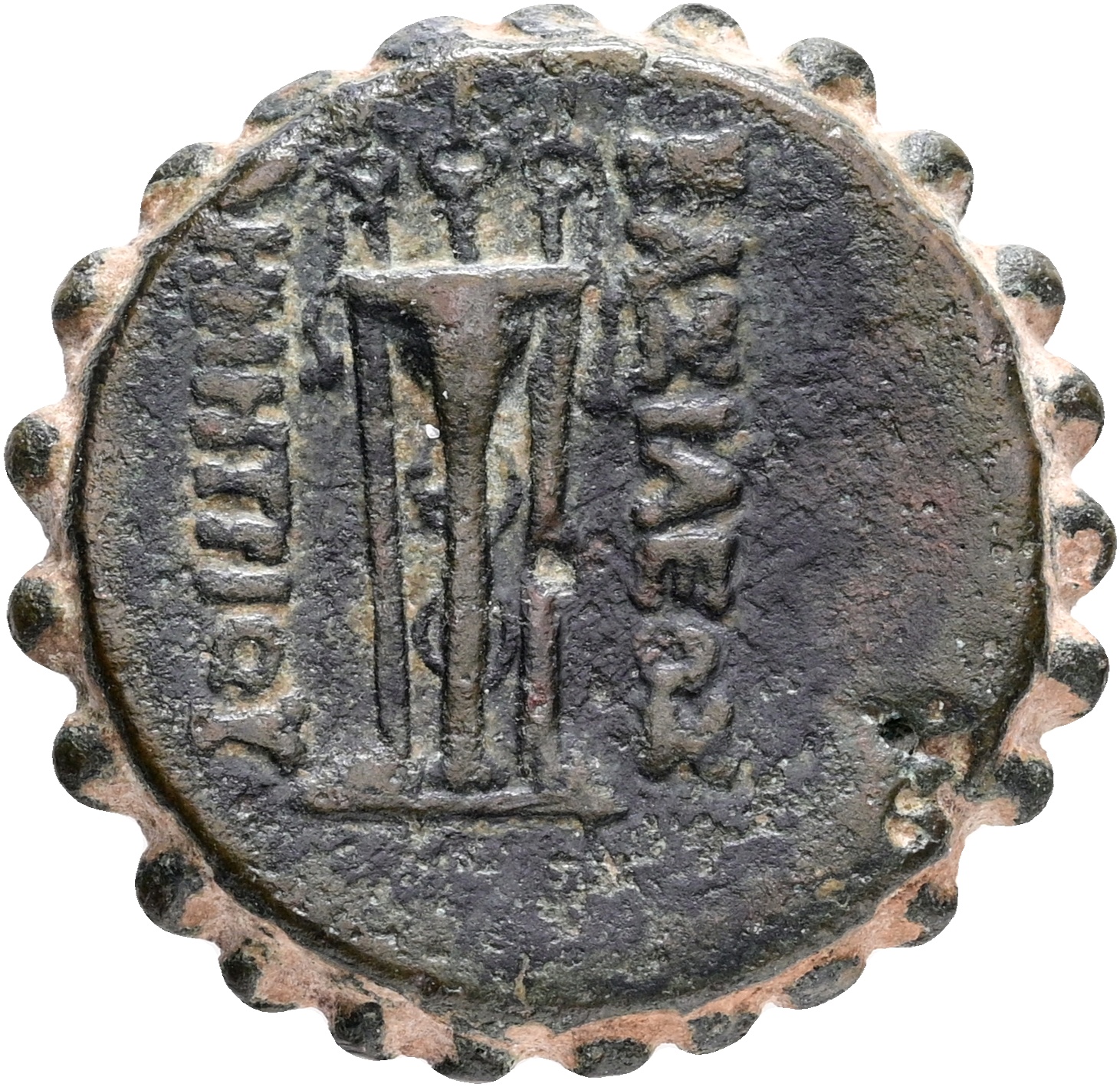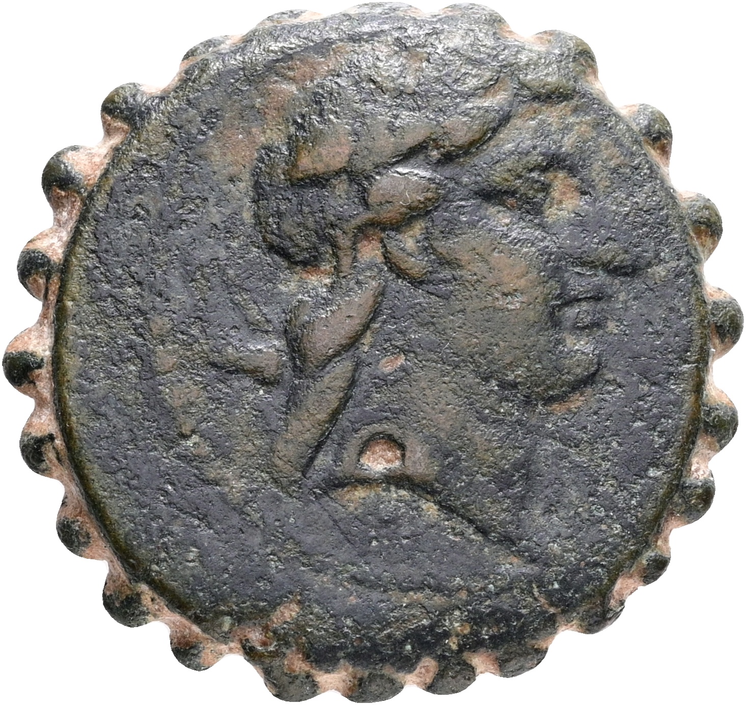 Ancient Greece, Seleukid Empire, Demetrios I Soter (162-150 BC). Antioch on the Orontes. AE Serrate. Laureate head of Apollo to right, bow and quiver over shoulder / ΒΑΣΙΛΕΩΣ ΔΗΜΗΤΡΙΟΥ, tripod. 14.85 g. SC 1644; HGC 9, 821. VF-F. Ex. B. Ahlström Mynthandel AB at Coin Fair in Copenhagen, 06.11.1993.