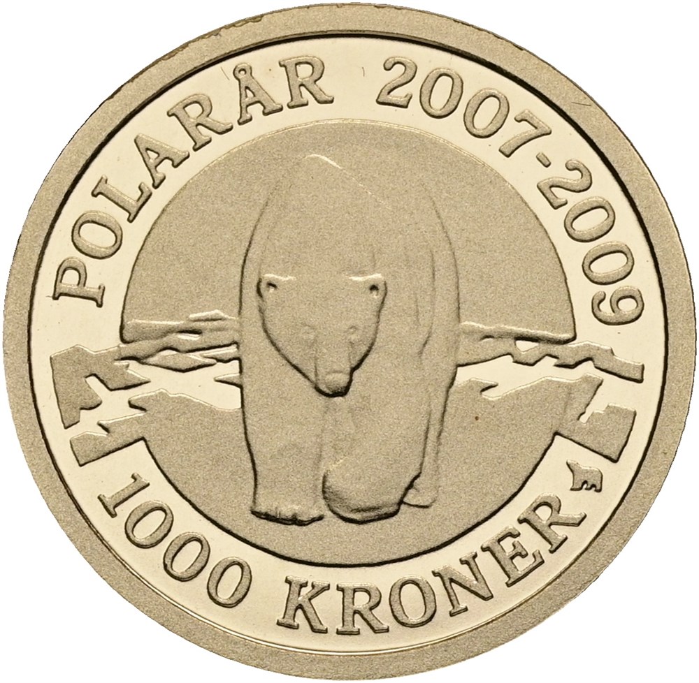 Margrethe II, 1000 kroner 2007, isbjørn, polarmønt, Au (900/1000), 8,65 g, Sieg 1B, kv. Proof – i original kapsel og æske, samt med certifikat.