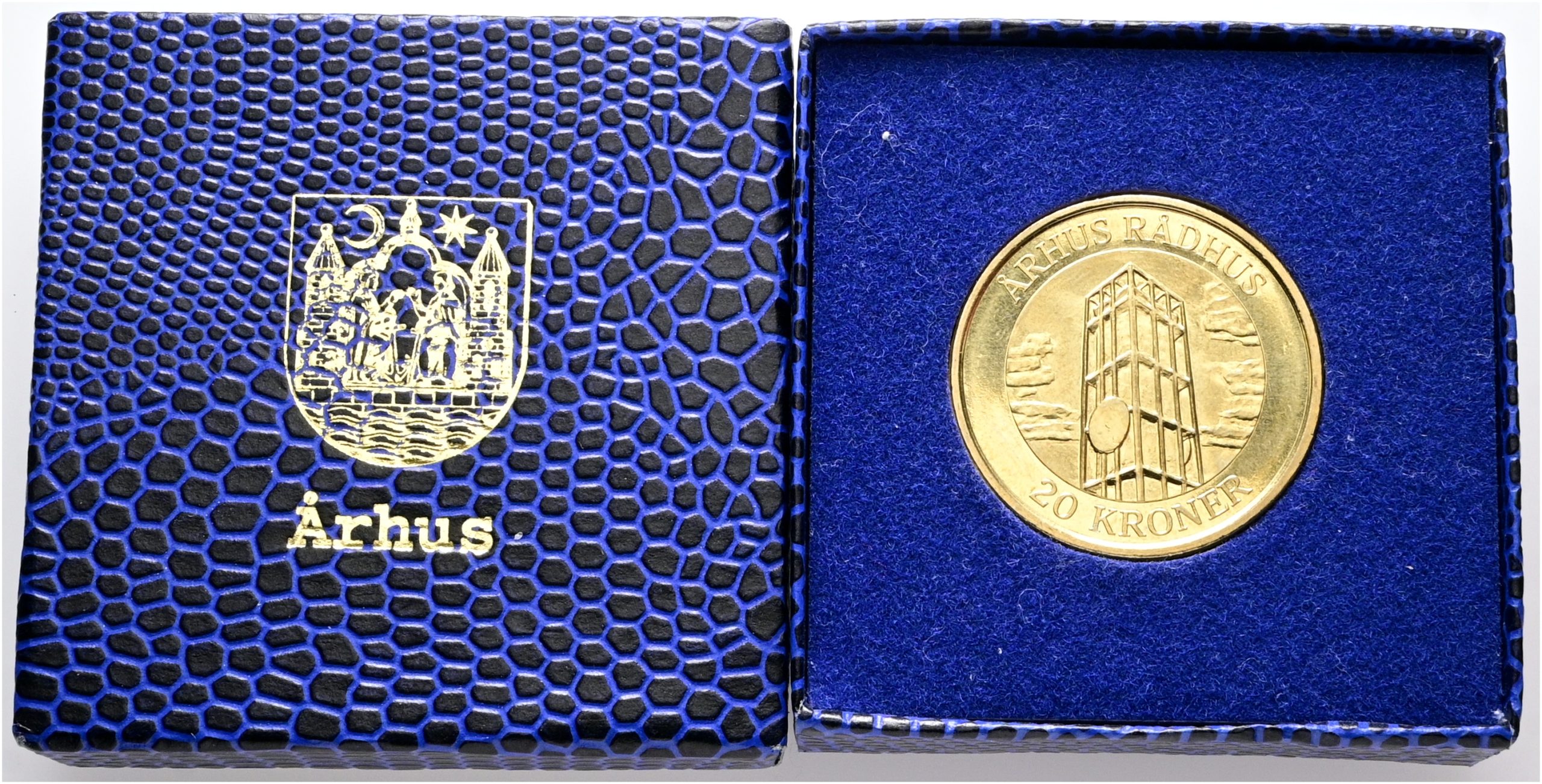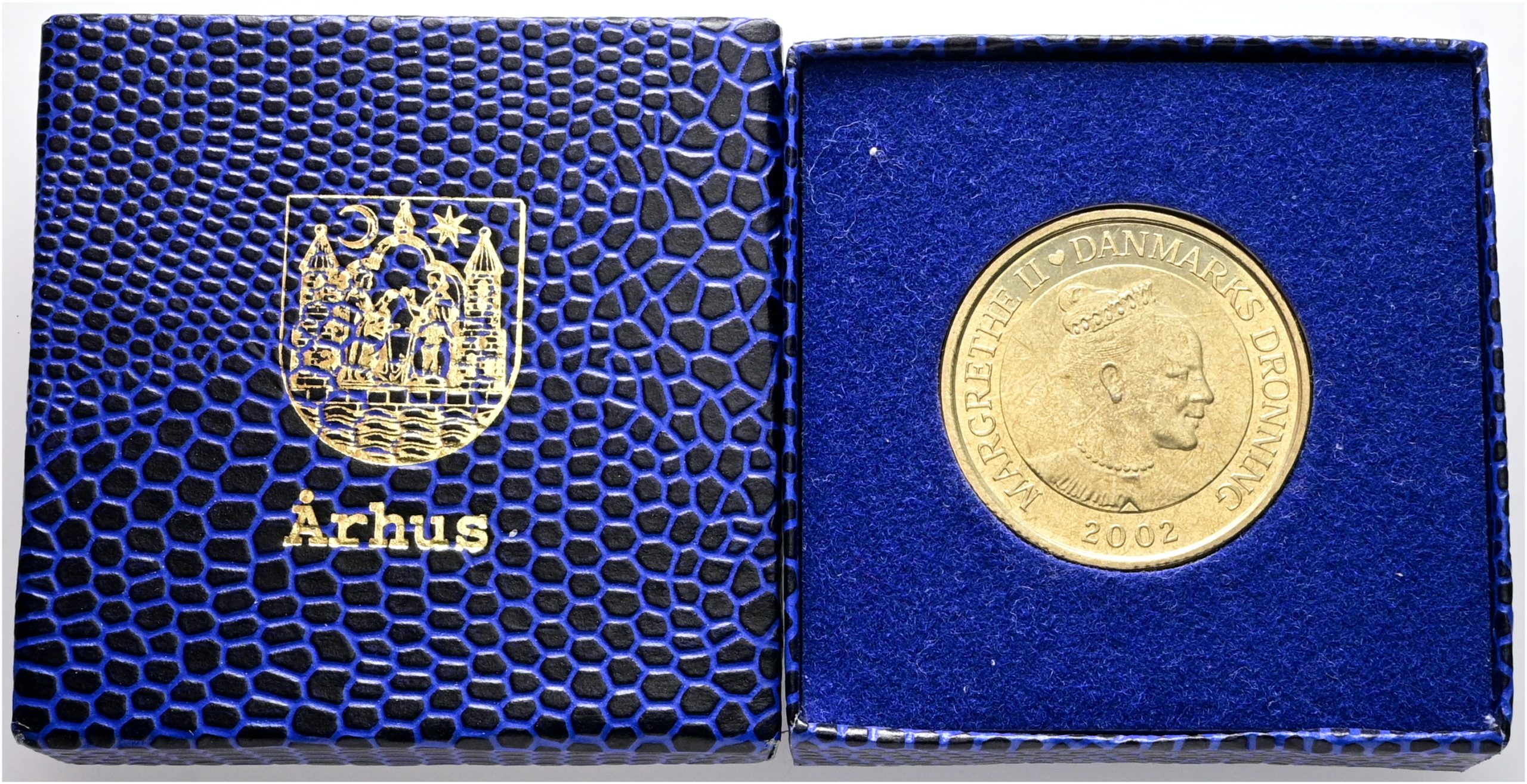 Margrethe II, 20 kroner 2002, Århus Rådhus, Sieg 1, kv. 0-01/0 – i æske påtrykt “Århus” samt byens byvåben.