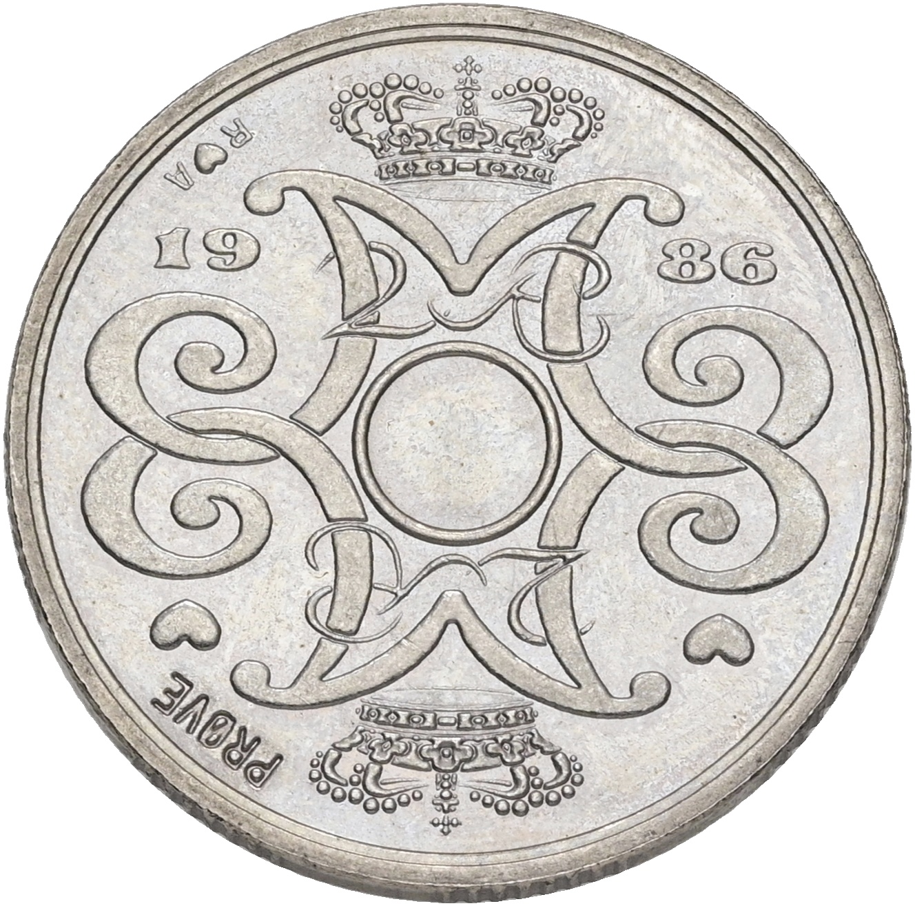 Margrethe II, prøvemønt, 2 kroner 1986, GP 34b, riflingsforsøg h (8×7 riller, prægering 339), kv. 0-01