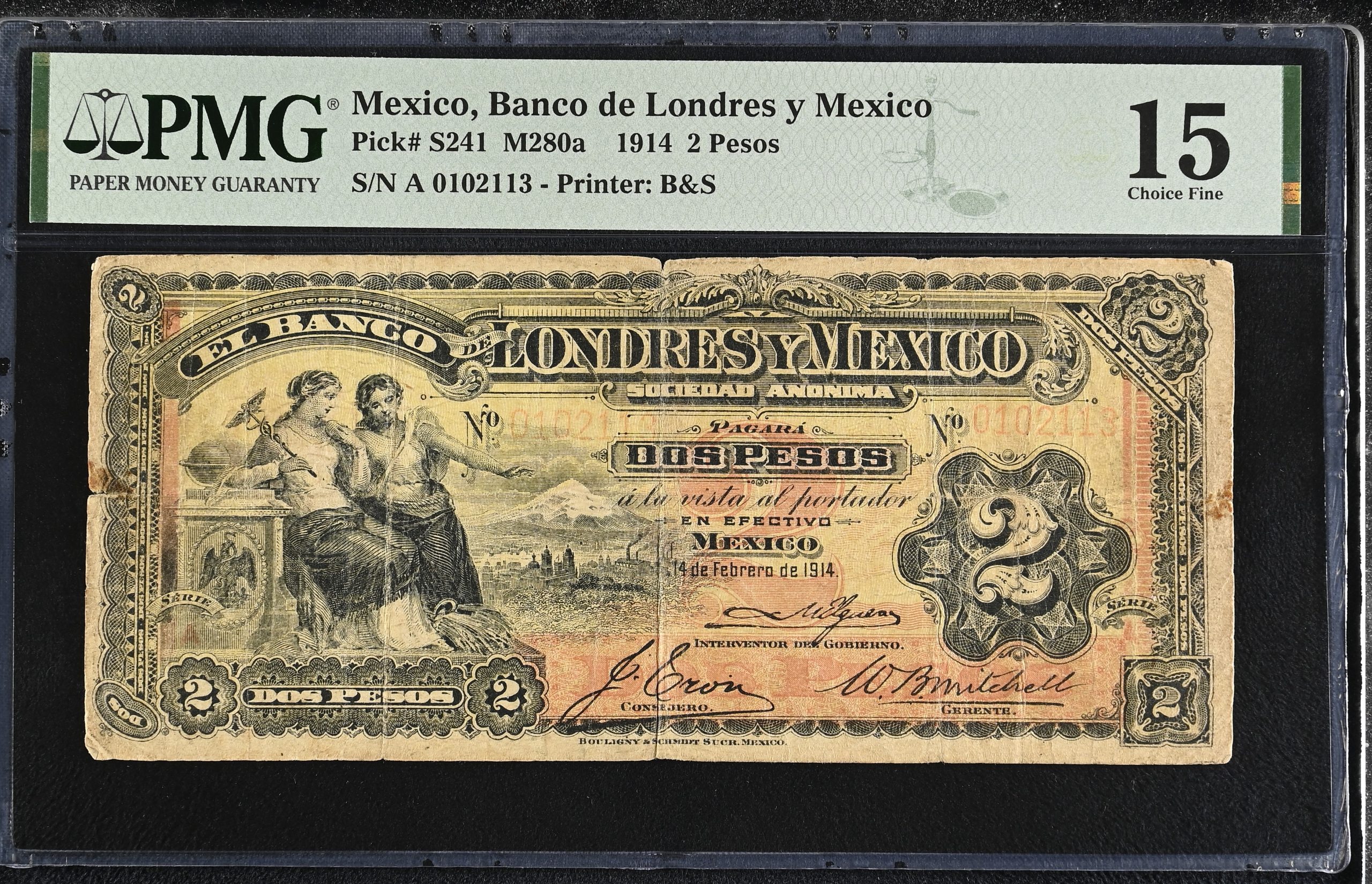 Mexico, Banco de Londres y Mexico, 2 Pesos 1914, no. A 0102113, Pick S241, PMG 15 Choise Fine – previously mounted.
