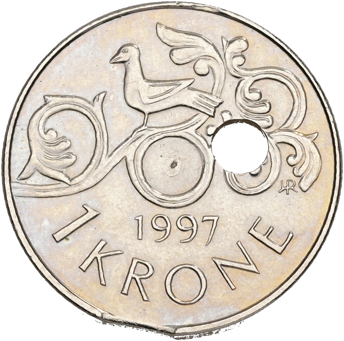 Norge, Harald V, 1 krone 1997, Sieg 119, kv. 0-01 – fejlmønt med fejlcentreret hul og hugpibemærke.