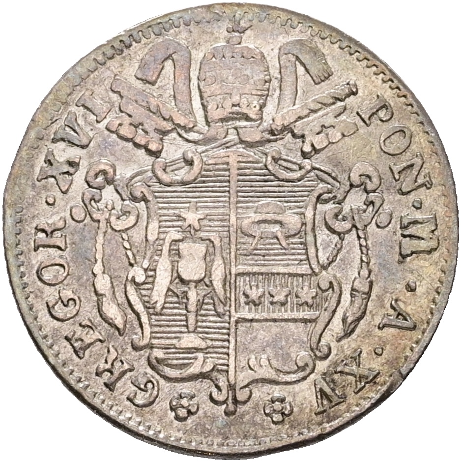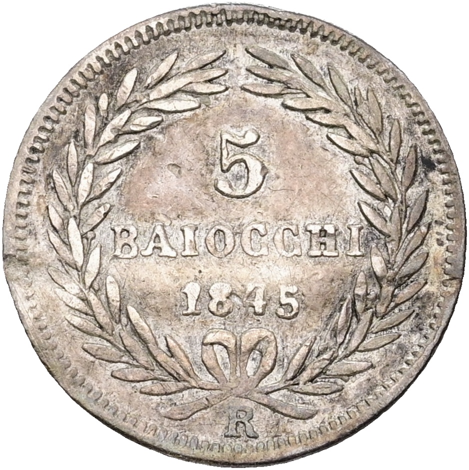 Papal States, Gregorius XVI, 5 Baiocchi 1845, KM 1321, VF, straightened.