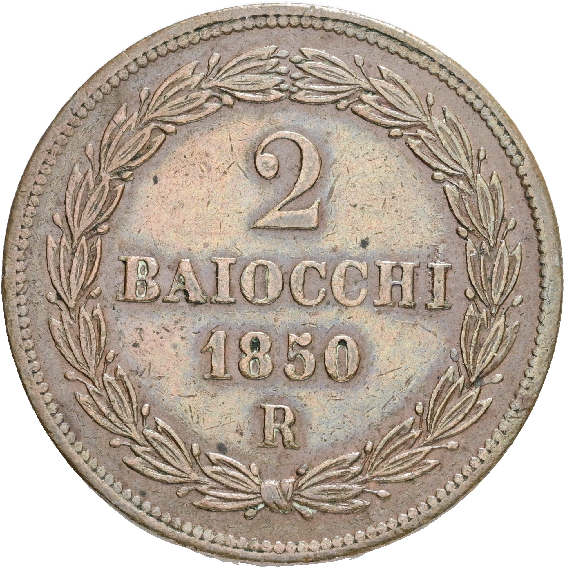 Papal States, Pius IX, 2 Baiocchi 1850 R, without initials, KM 1344, VF, lightly cleaned.