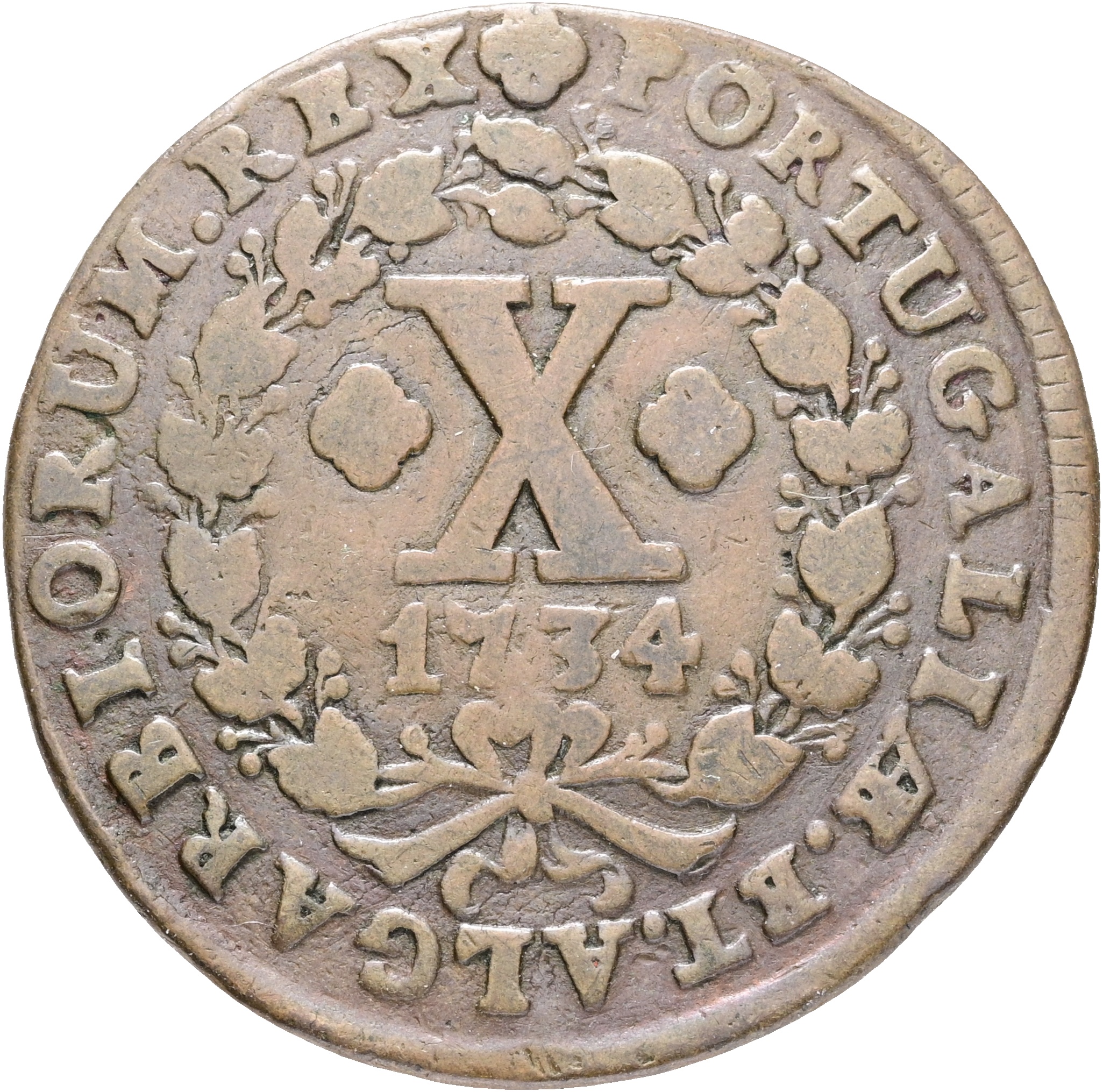 Portugal, João V (1706-1750), 10 Reis 1734, KM 217, F, slightly bent.