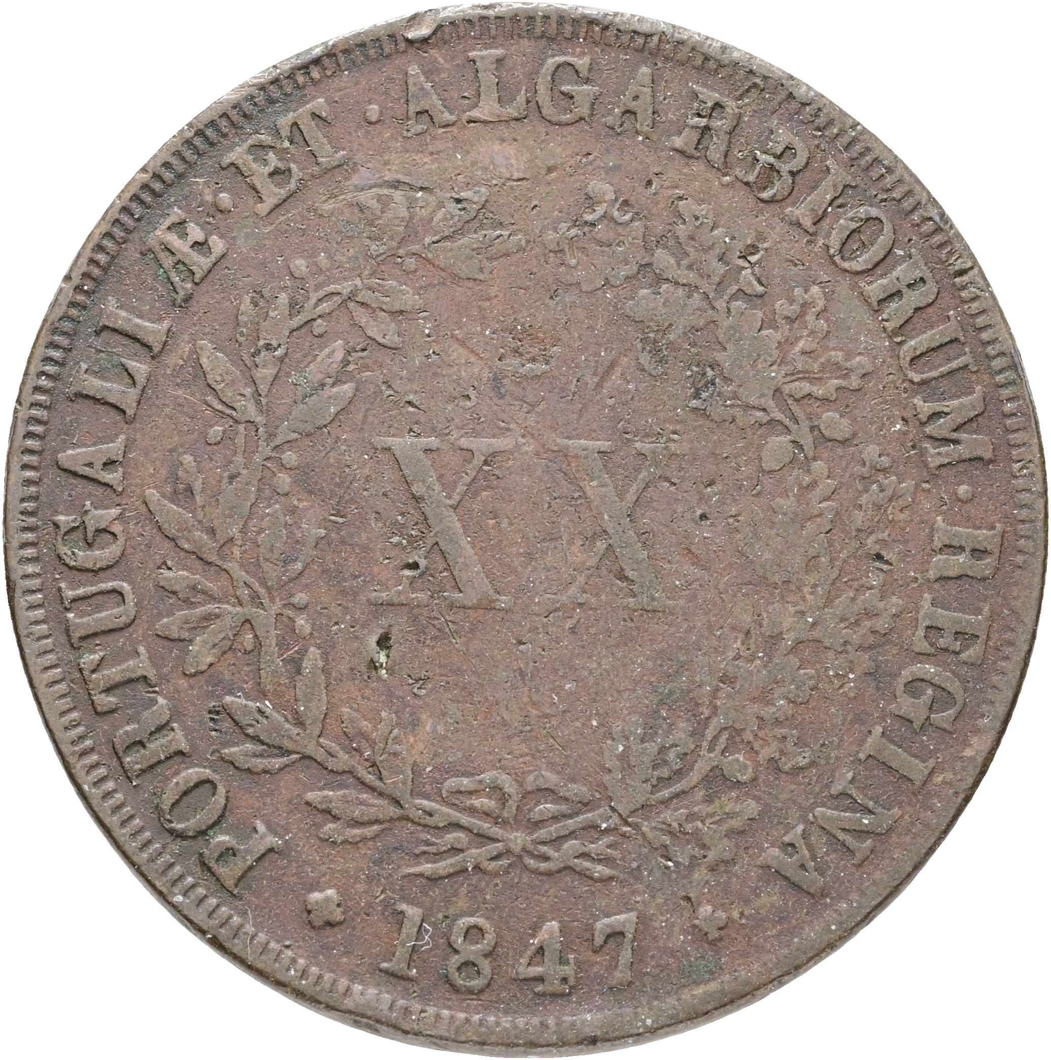 Portugal, Maria II (1834-1853), 20 Reis 1847, KM 482, F, edge nicks.