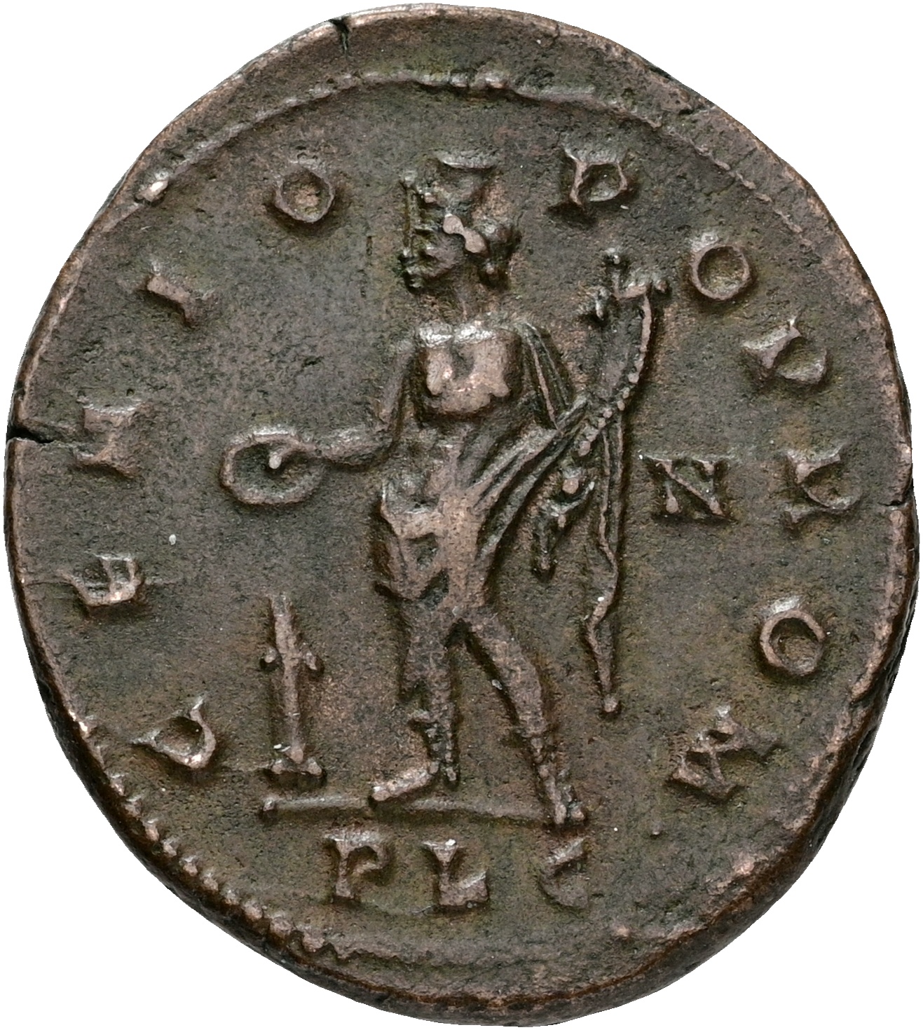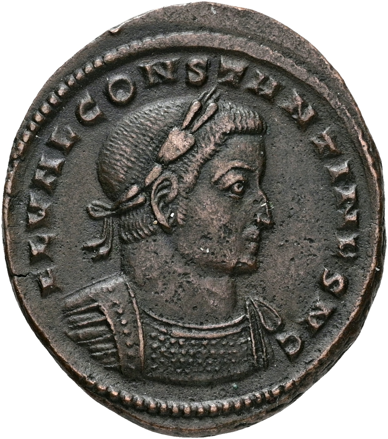 Roman Empire, Constantine I ‘the Great’, as Caesar, BI Nummus. Lugdunum, AD 307. FL VAL CONSTANTINVS N C, laureate and cuirassed bust to right / GENIO POP ROM, Genius, wearing modius on head, standing to left, holding cornucopiae and patera over altar; N in right field, PLC in exergue. 7.00 g. RIC VI 231. VF. Ex. Fyns Numismatiske Forening, auction, 04.12.2003.