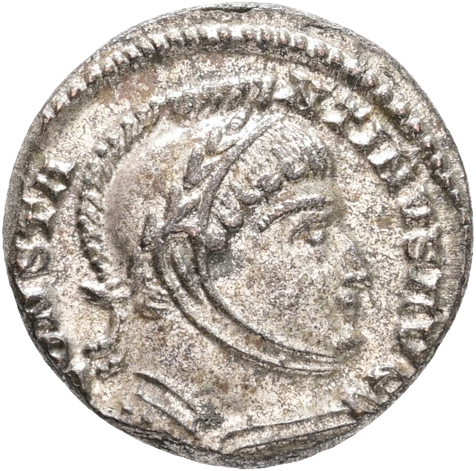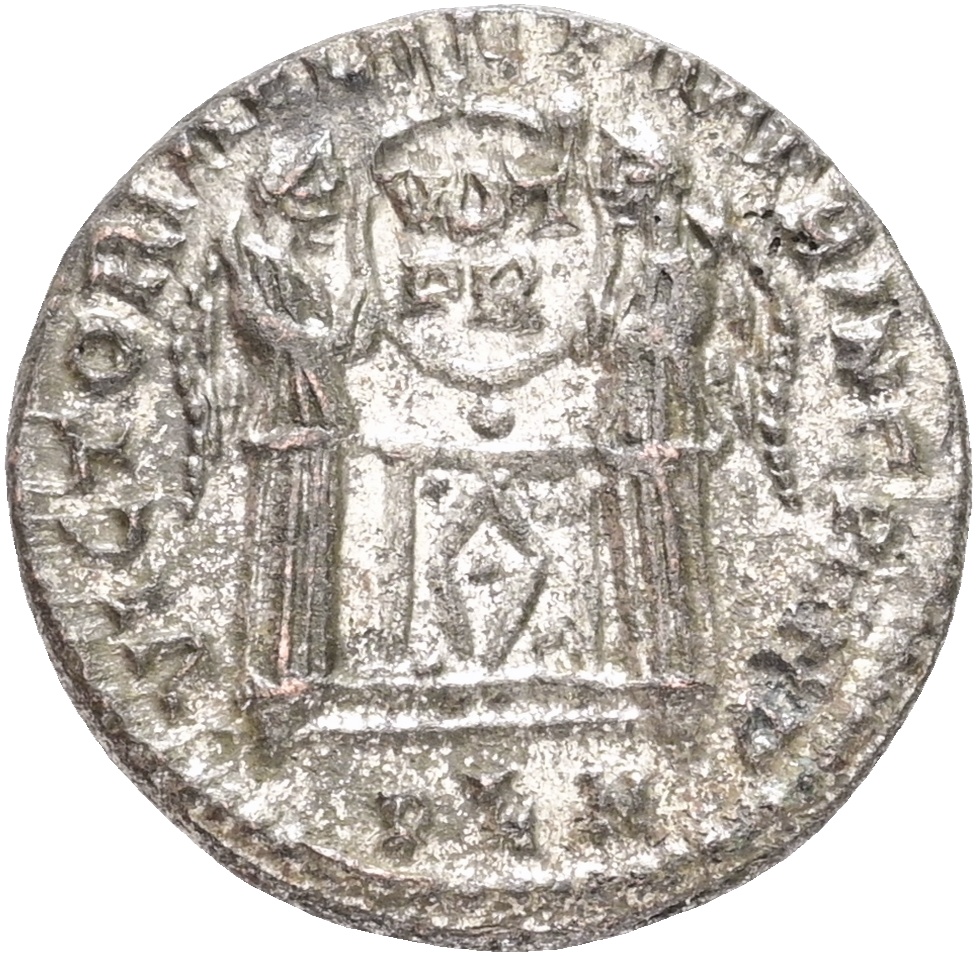 Helmeted and cuirassed bust left / Two Victories standing vis-à-vis, holding between them a shield inscribed VOT/ PR in two lines set on an altar decorated with a star within wreath; PLN