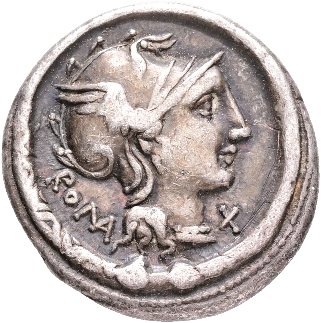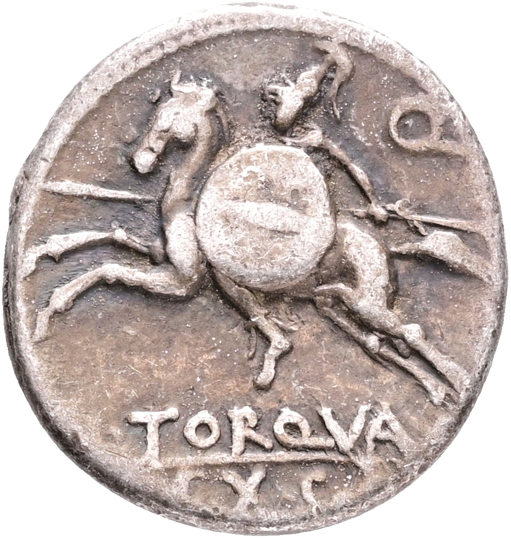Roman Republic, L. Manlius Torquatus, 113-112 BC. Denarius. Rome. Helmeted head of Roma to right; ROMA (partially ligate) behind, X (mark of value) below chin; all within torque border. Rev. Warrior on horseback charging to left, holding spear and shield; Q to right, L•TORQVA below, EX•S•C in exergue. Crawford 295. 3.72 g. VF. Small scratches on obverse, fine old toning.