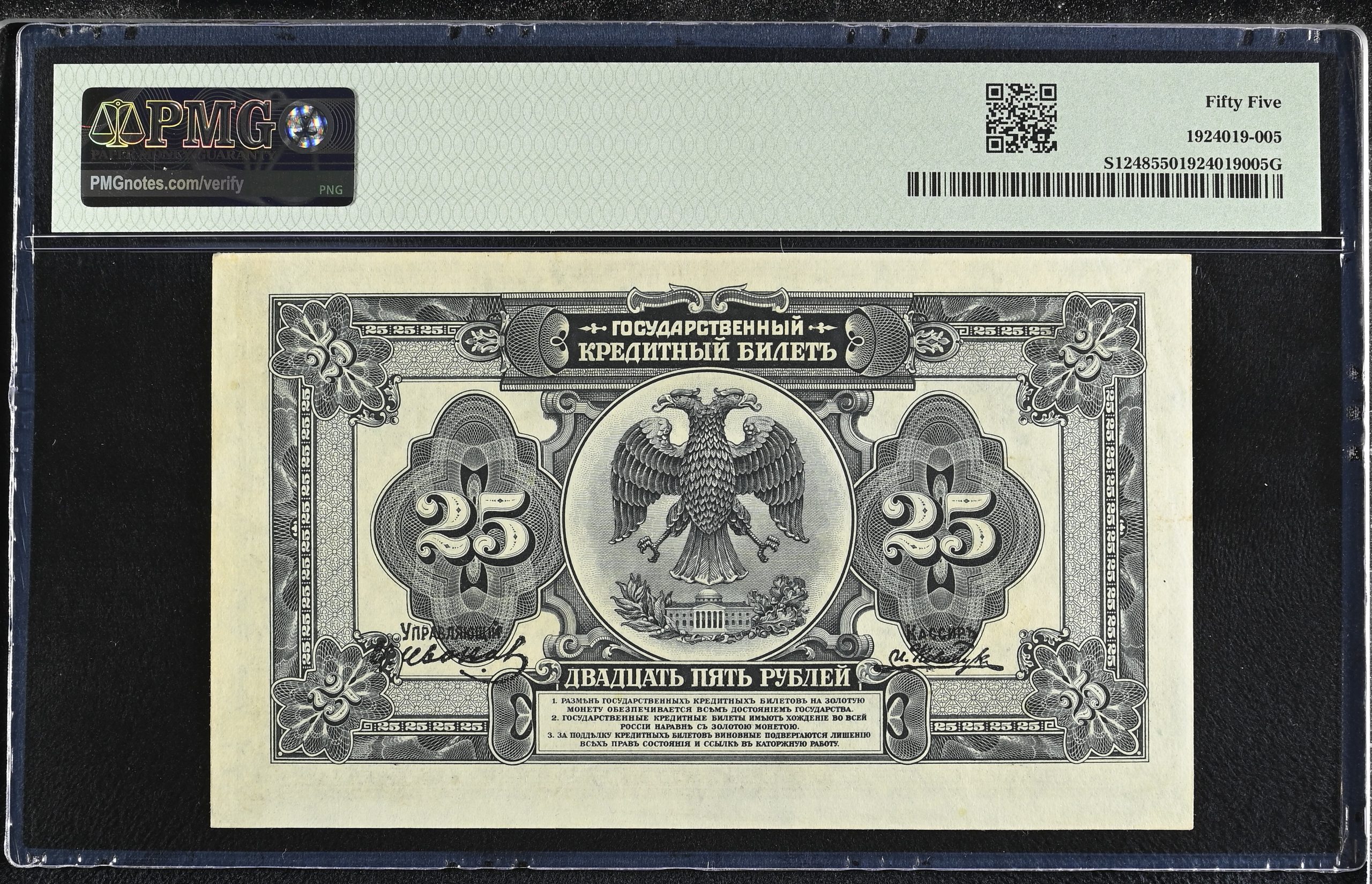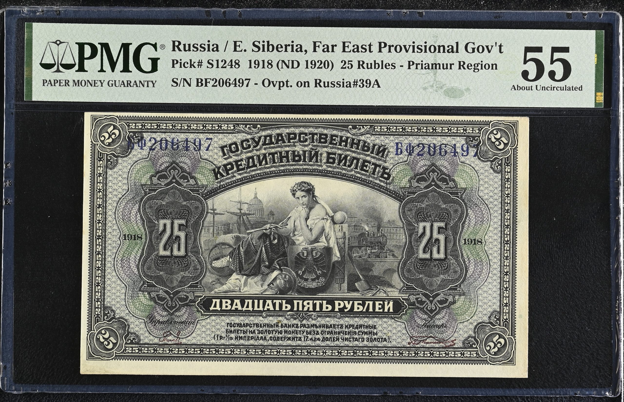 Russia / E. Siberia, Far East Provisional Government, 25 Roubles 1918 (ND1920) – Priamur Region, no. BF206497, Pick S1248, Overprint on Russia 39A, PMG 55 About Uncirculated.