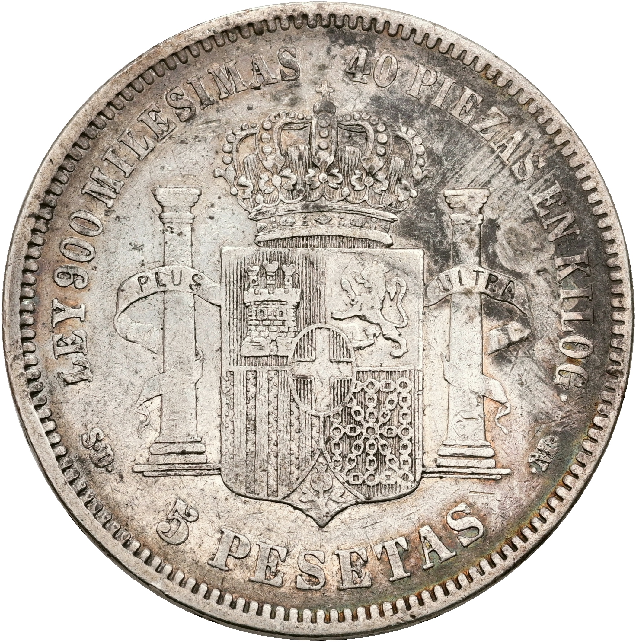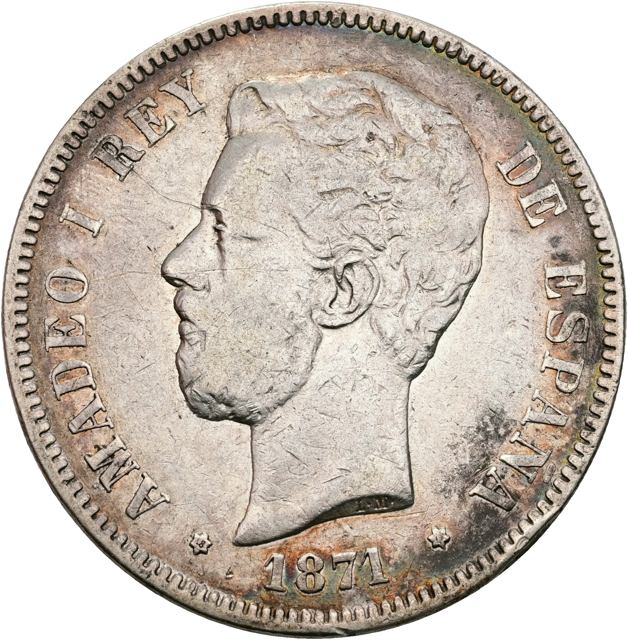 Spain, Amadeo, 5 Pesetas 1871 🟌 SD M, KM 666, VF-F.