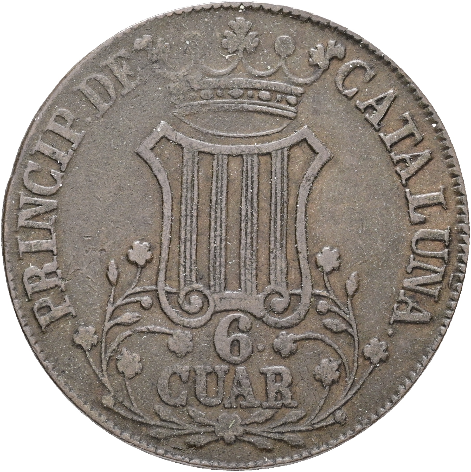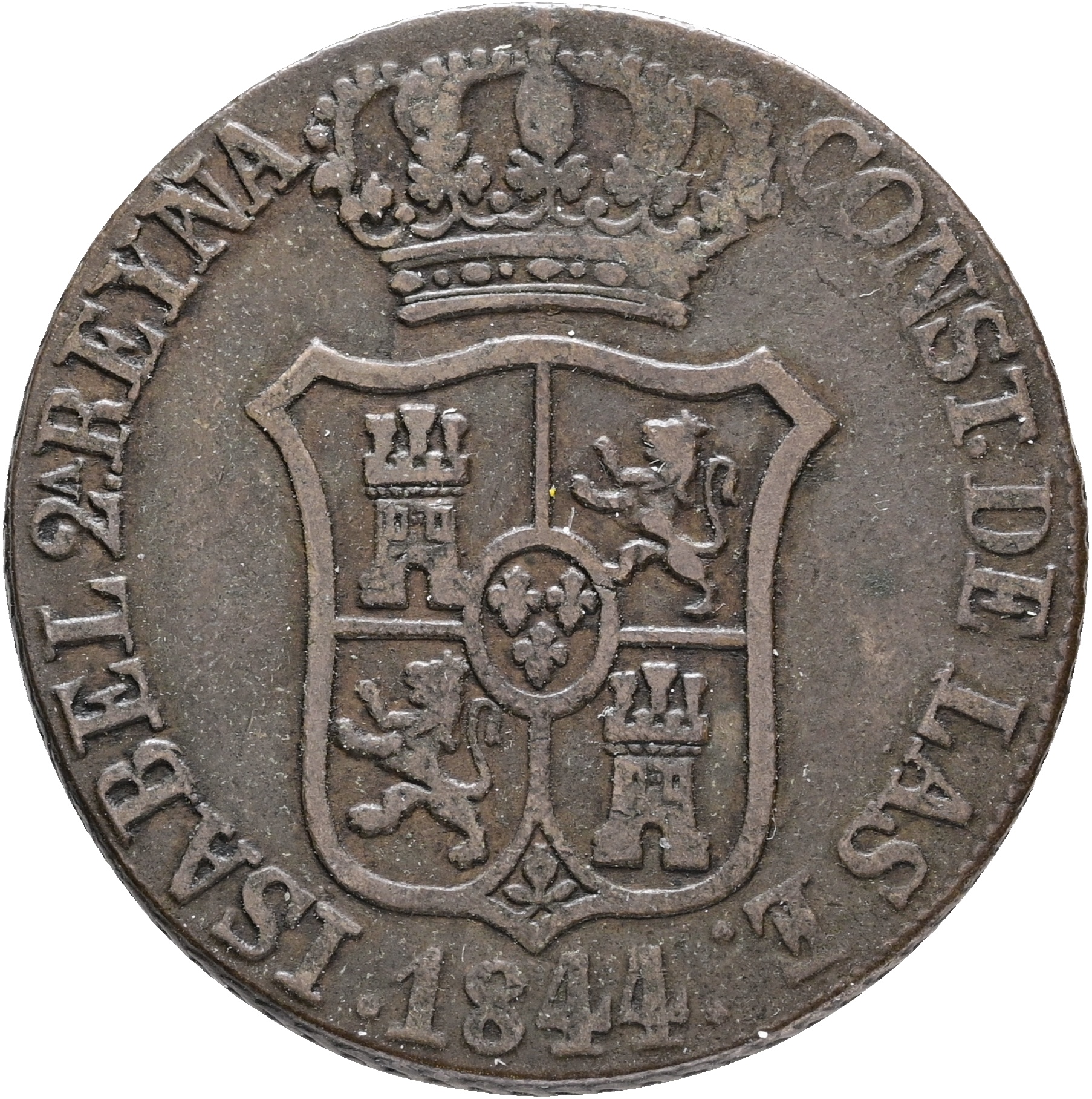 Spain, Catalonia, Isabella II (1833-1868), 6 Cuartos 1844, Barcelona Mint, KM 128, VF