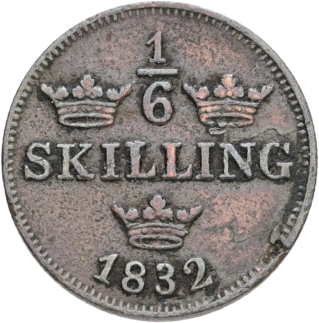 Sverige, Karl XIV Johan, 1/6 skilling 1832, SM 135, 1+-1, blanketfejl.
