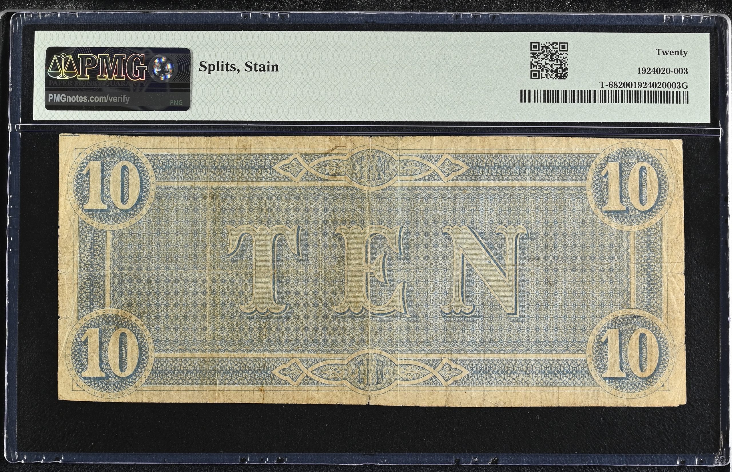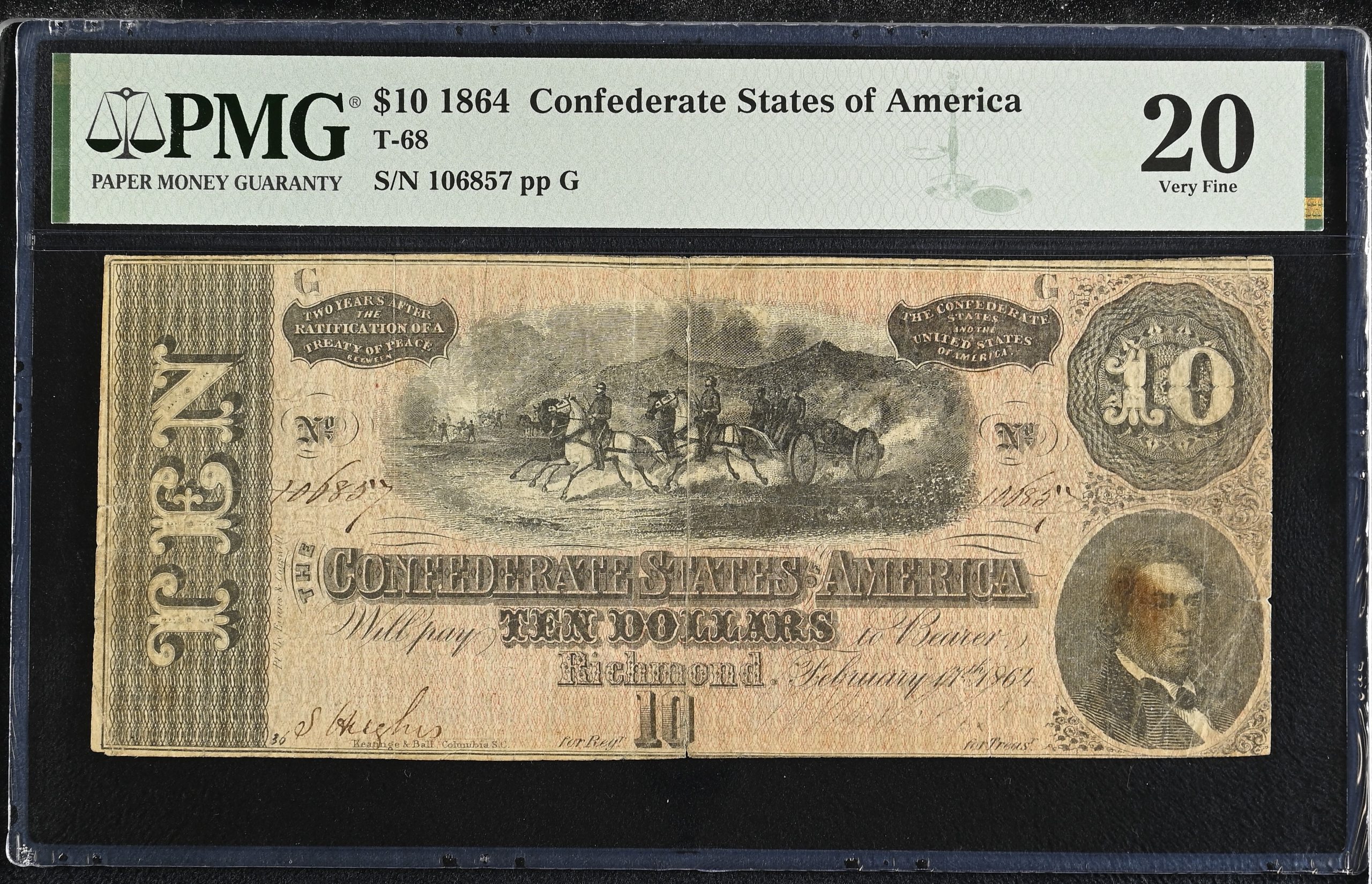 USA, Confederate States of America 10 Dollars 1864, no. 106857, T-68, PMG 20 Very Fine – splits, stain.