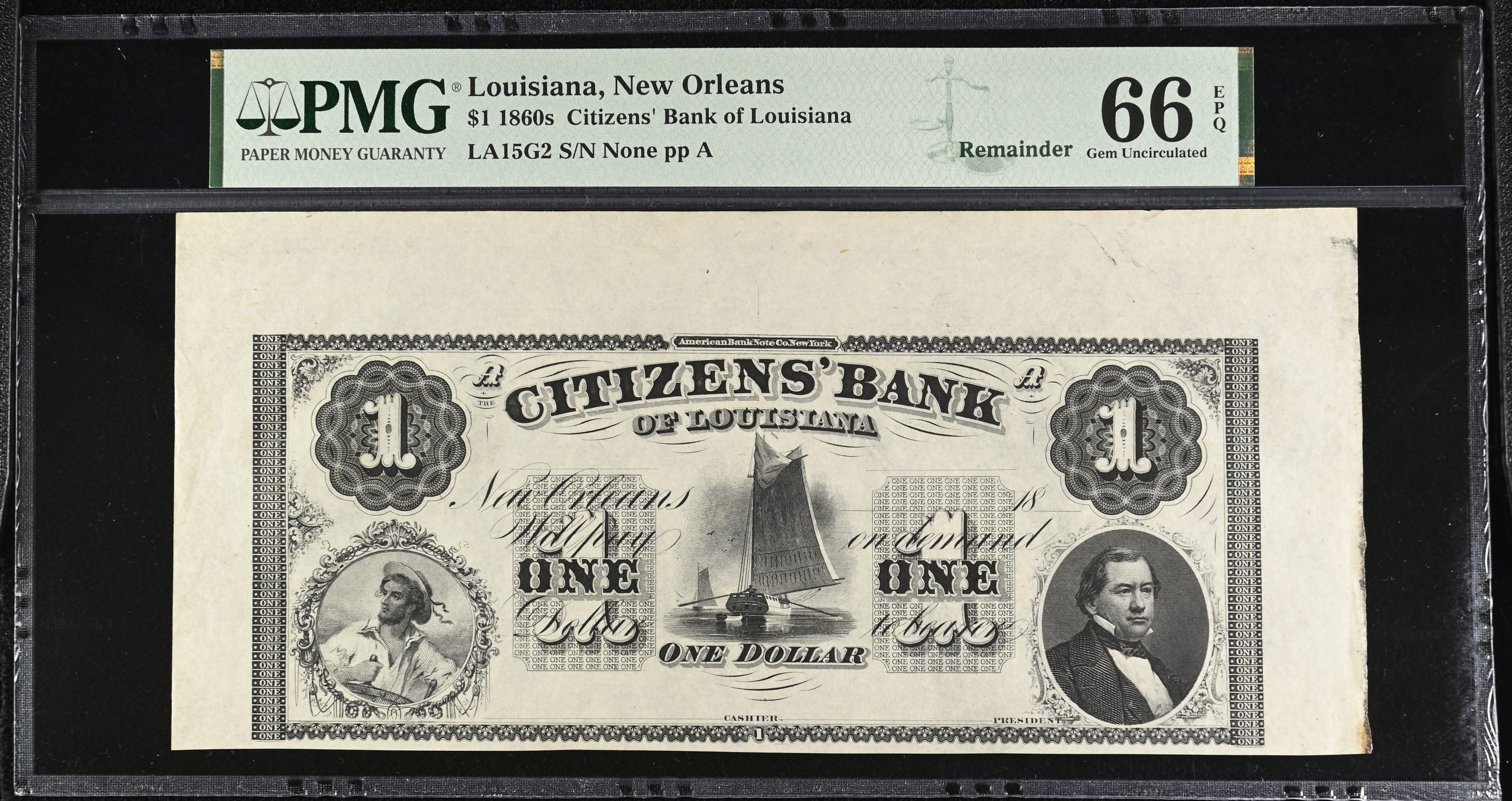 USA, Louisiana, New Orleans, 1860s Citizens’ Bank of Louisiana 1 Dollar, remainder, no. None pp A, LA15G2, PMG 66 Gem uncirculated – Exceptionel Paper Quality.